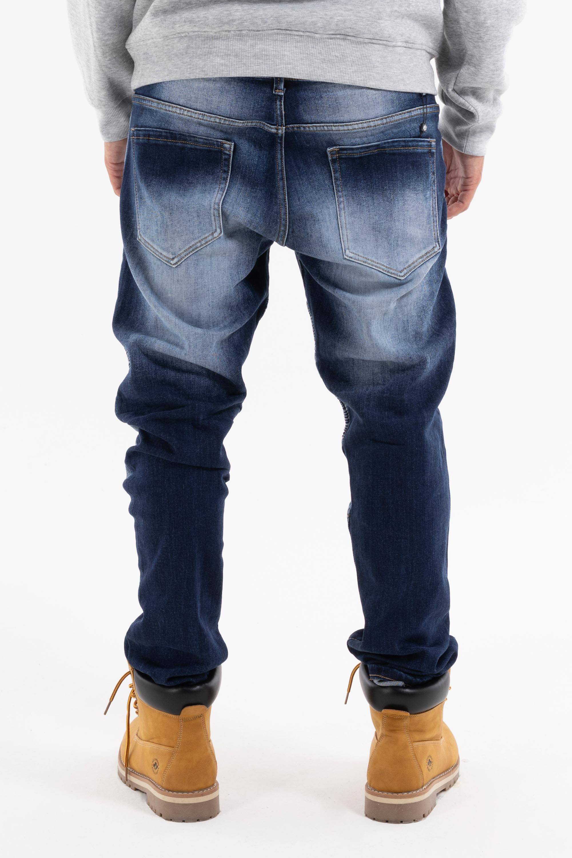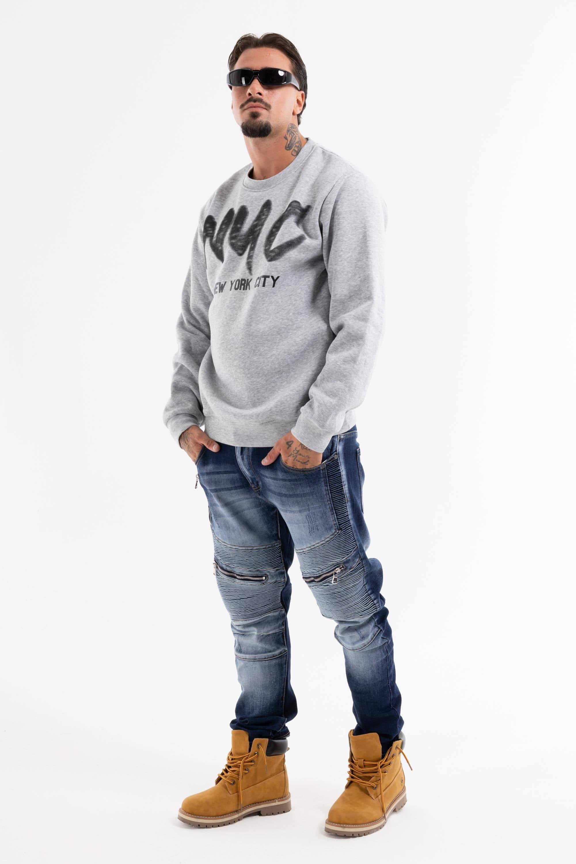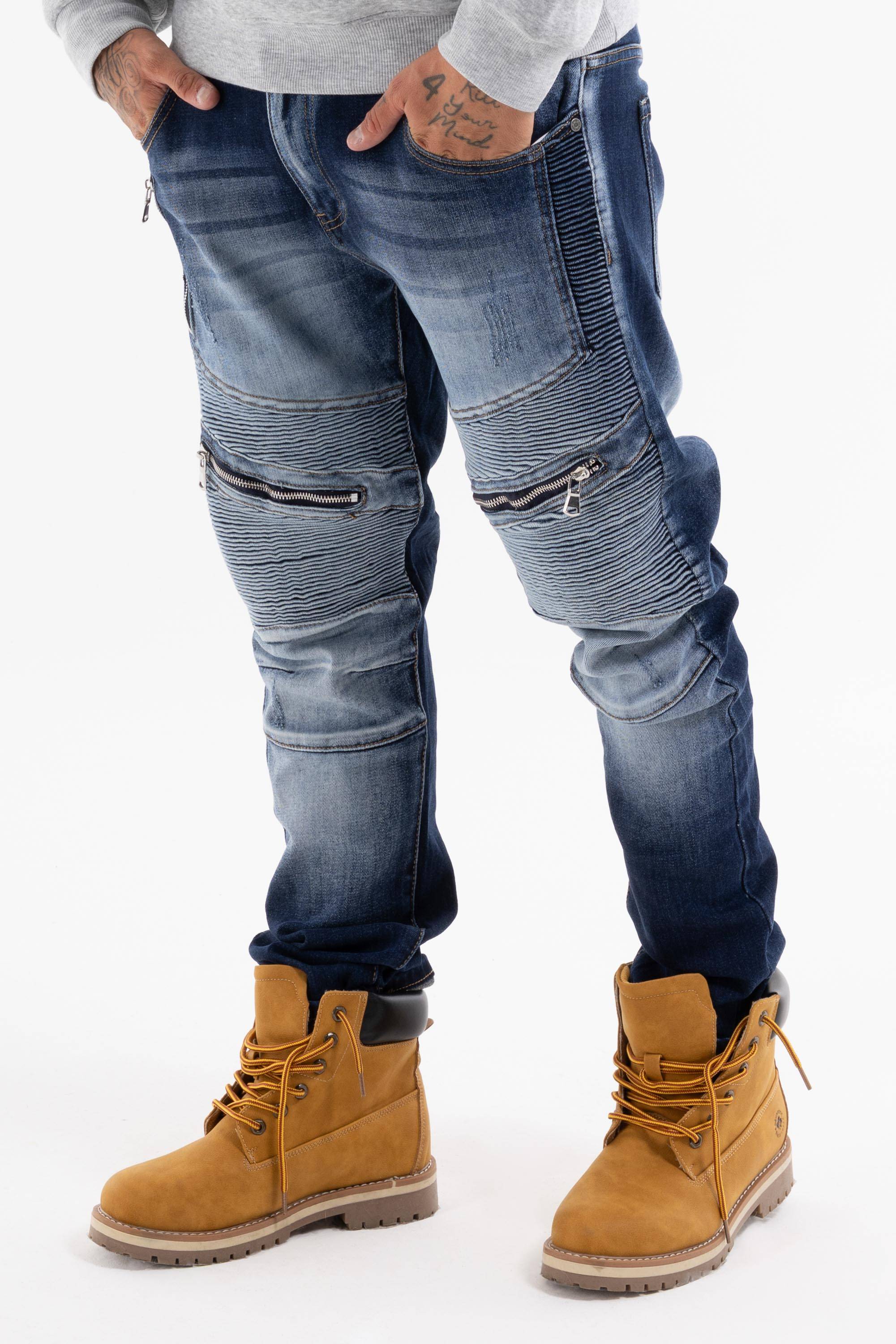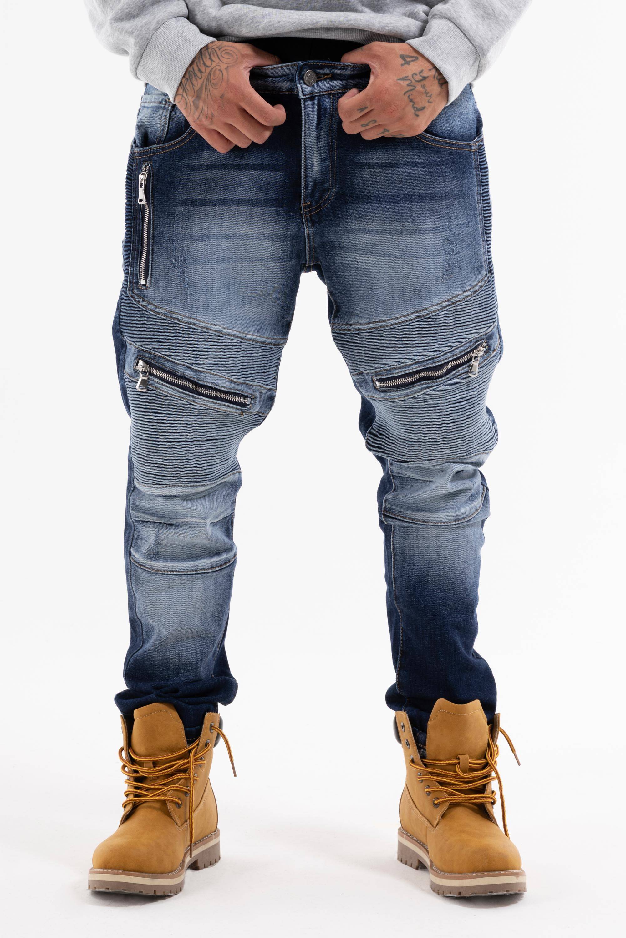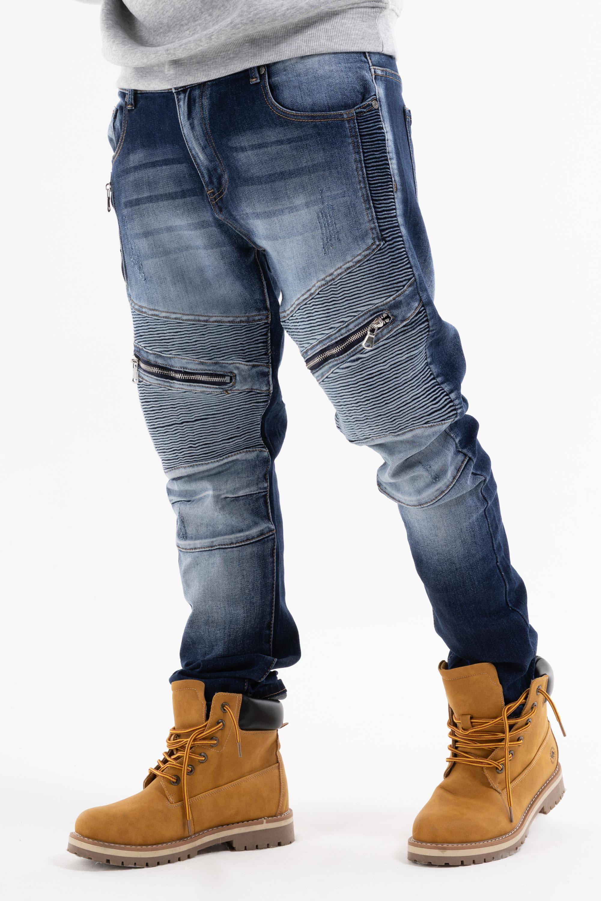 Jeans bikers con tasche frontali con zip e lavorazione effetto sabbiato per un look grintoso e deciso. Dettagli a contrasto e vestibilit� slim. Perfetti per outfit urban dal carattere forte.