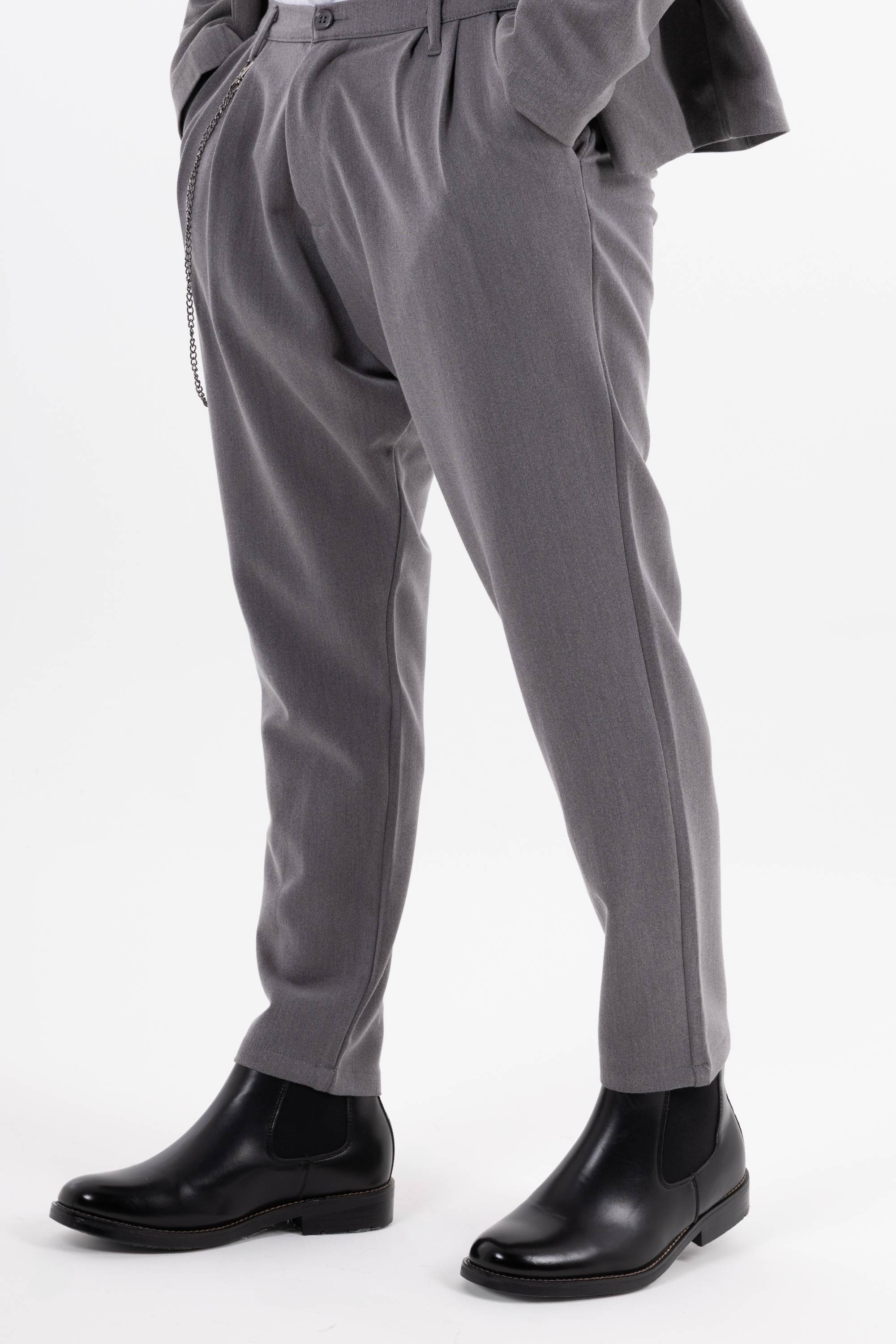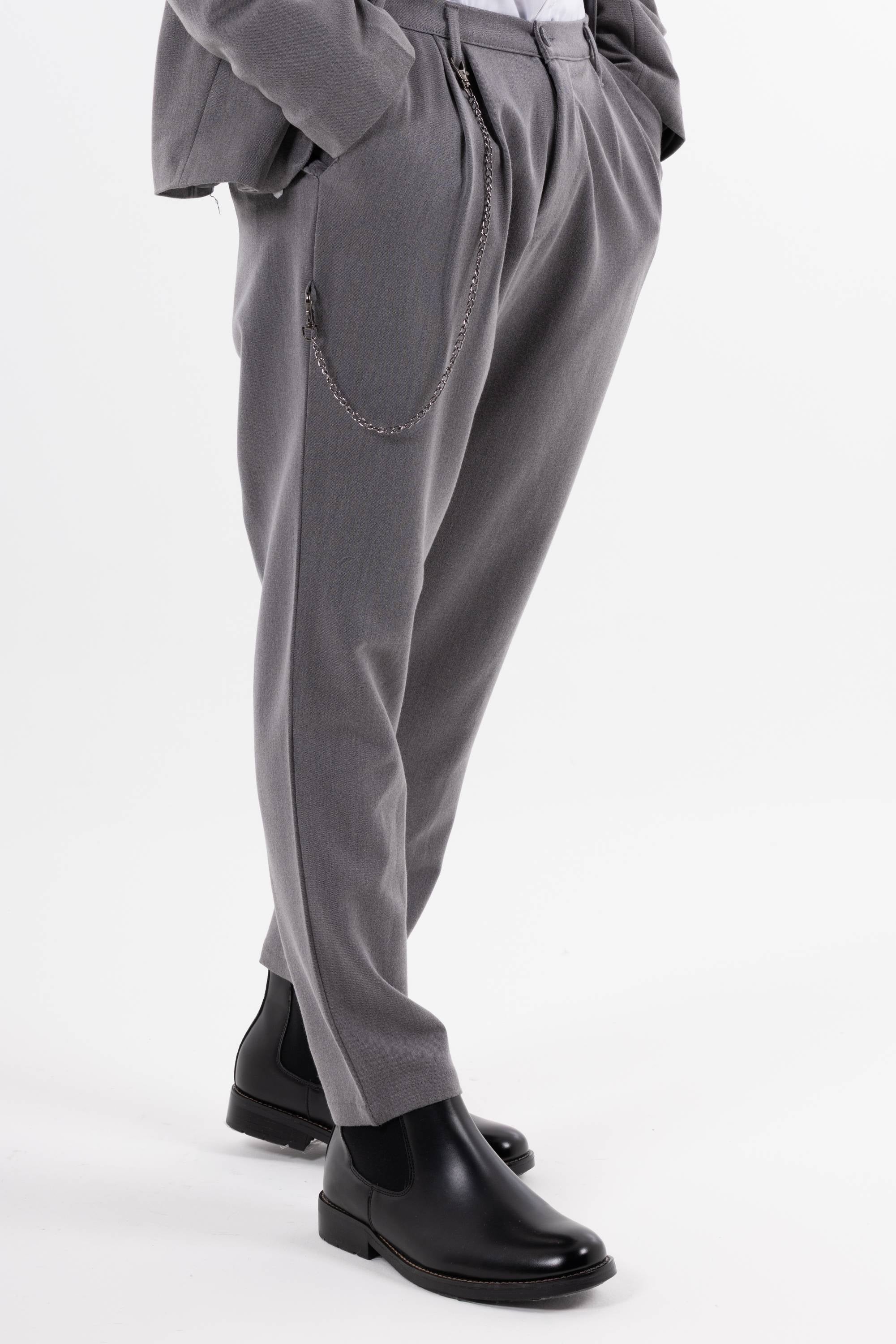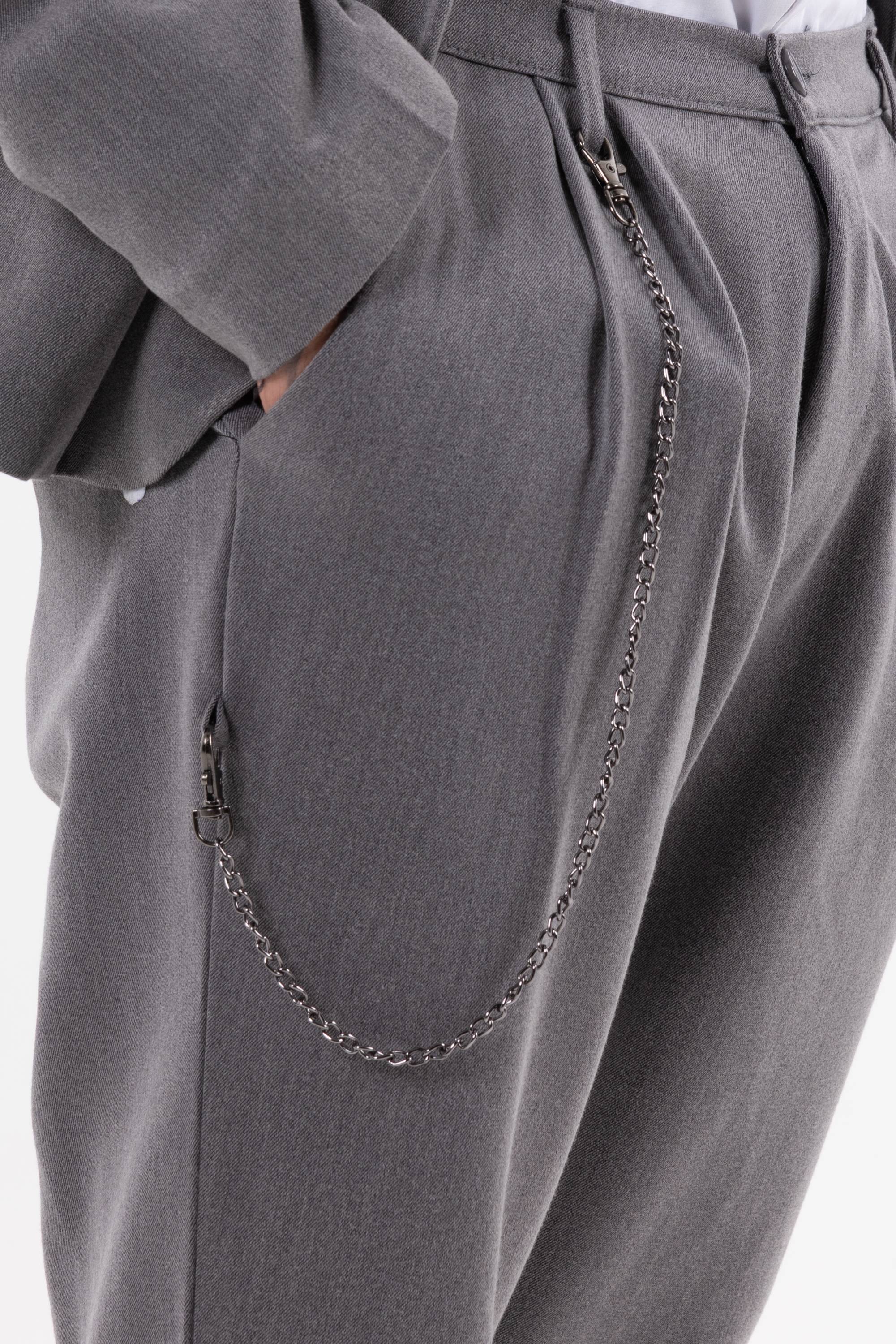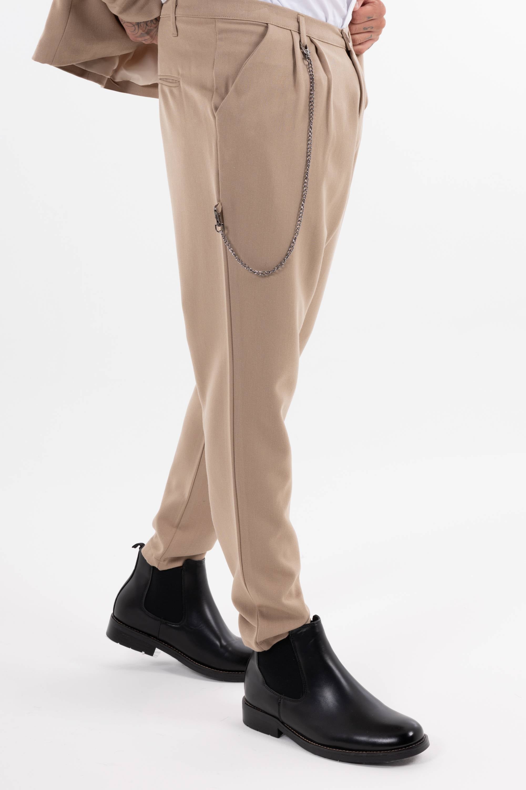 Pantaloni casual con pinces frontali e catena decorativa laterale che aggiunge un dettaglio urban. Risvolto alla caviglia e taglio morbido per unire stile e comfort. Disponibile giacca coordinabile.