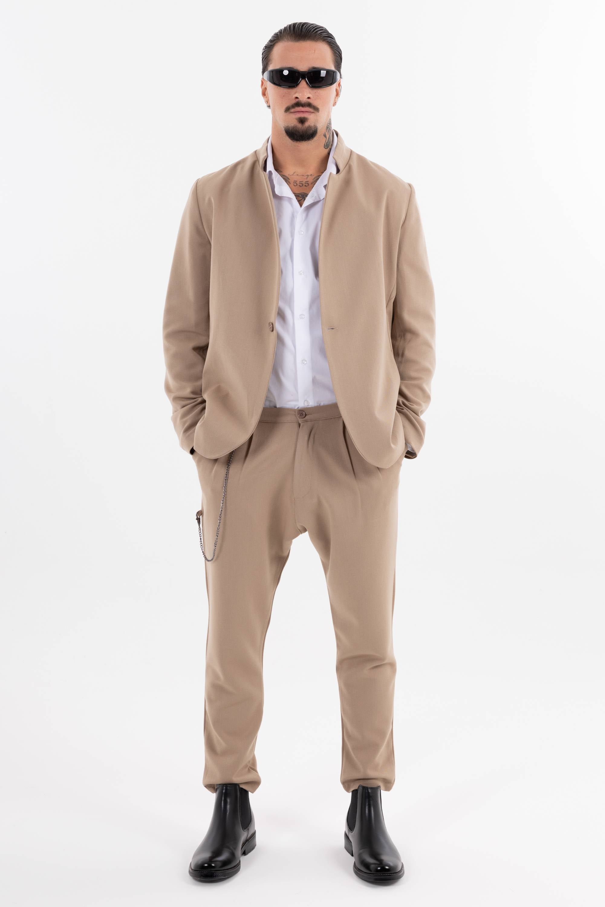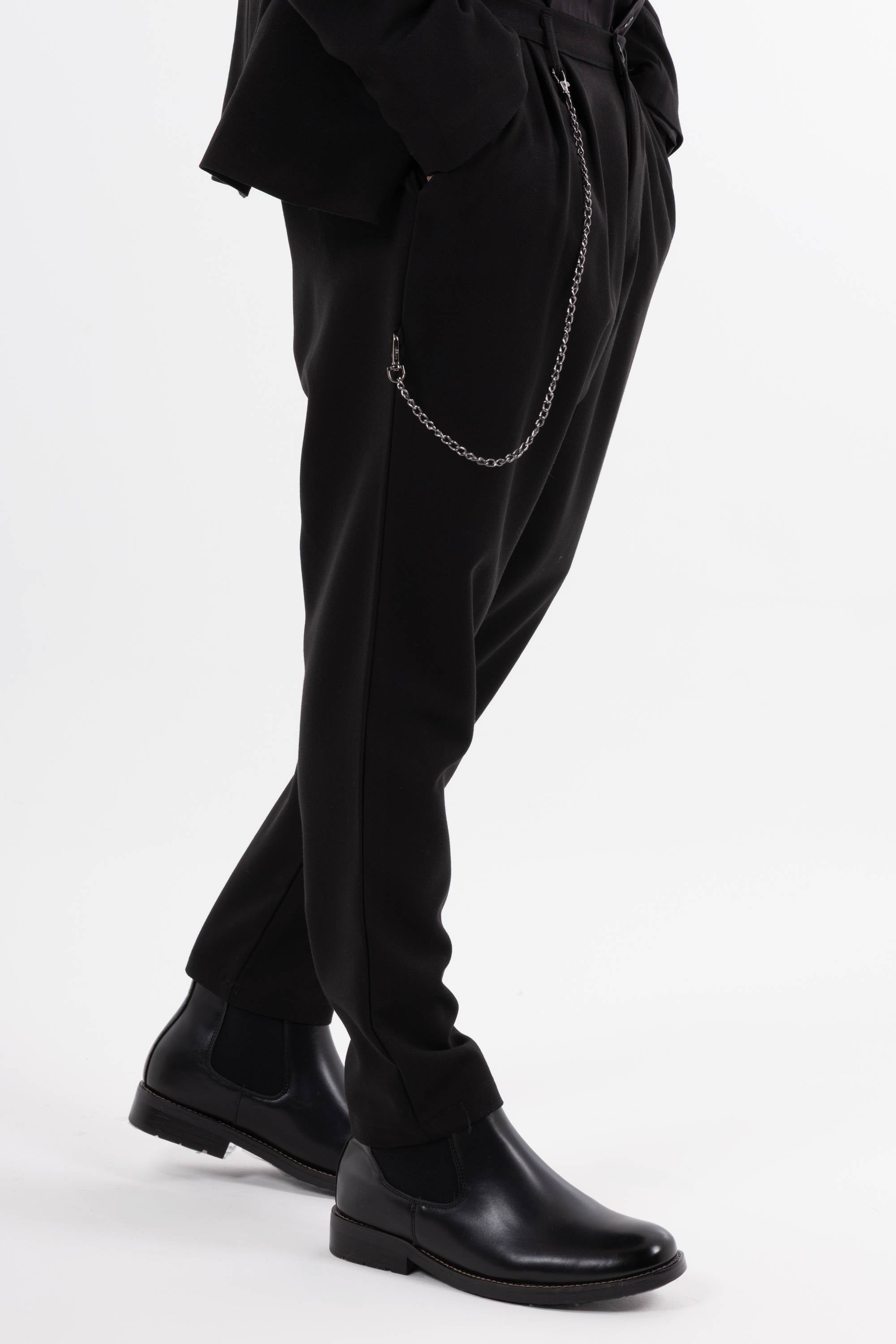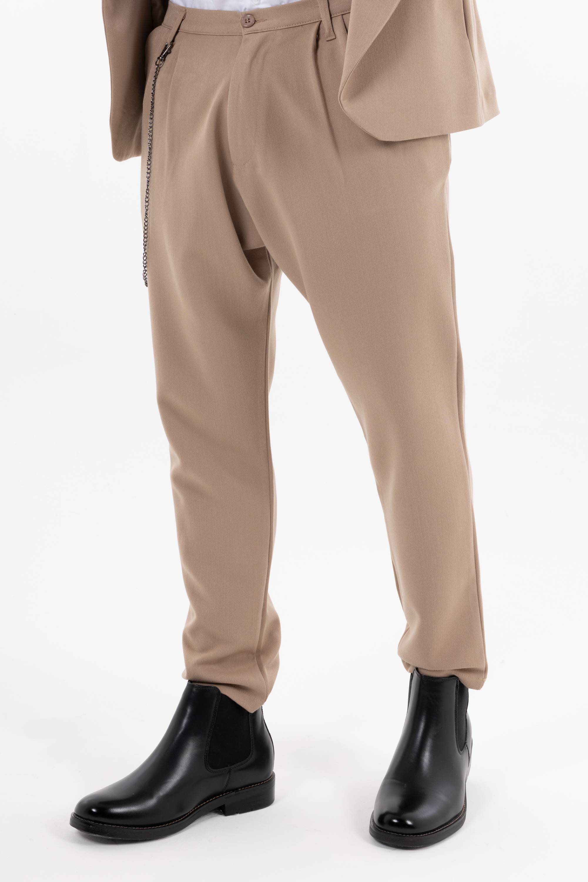 Pantaloni casual con pinces frontali e catena decorativa laterale che aggiunge un dettaglio urban. Risvolto alla caviglia e taglio morbido per unire stile e comfort. Disponibile giacca coordinabile.