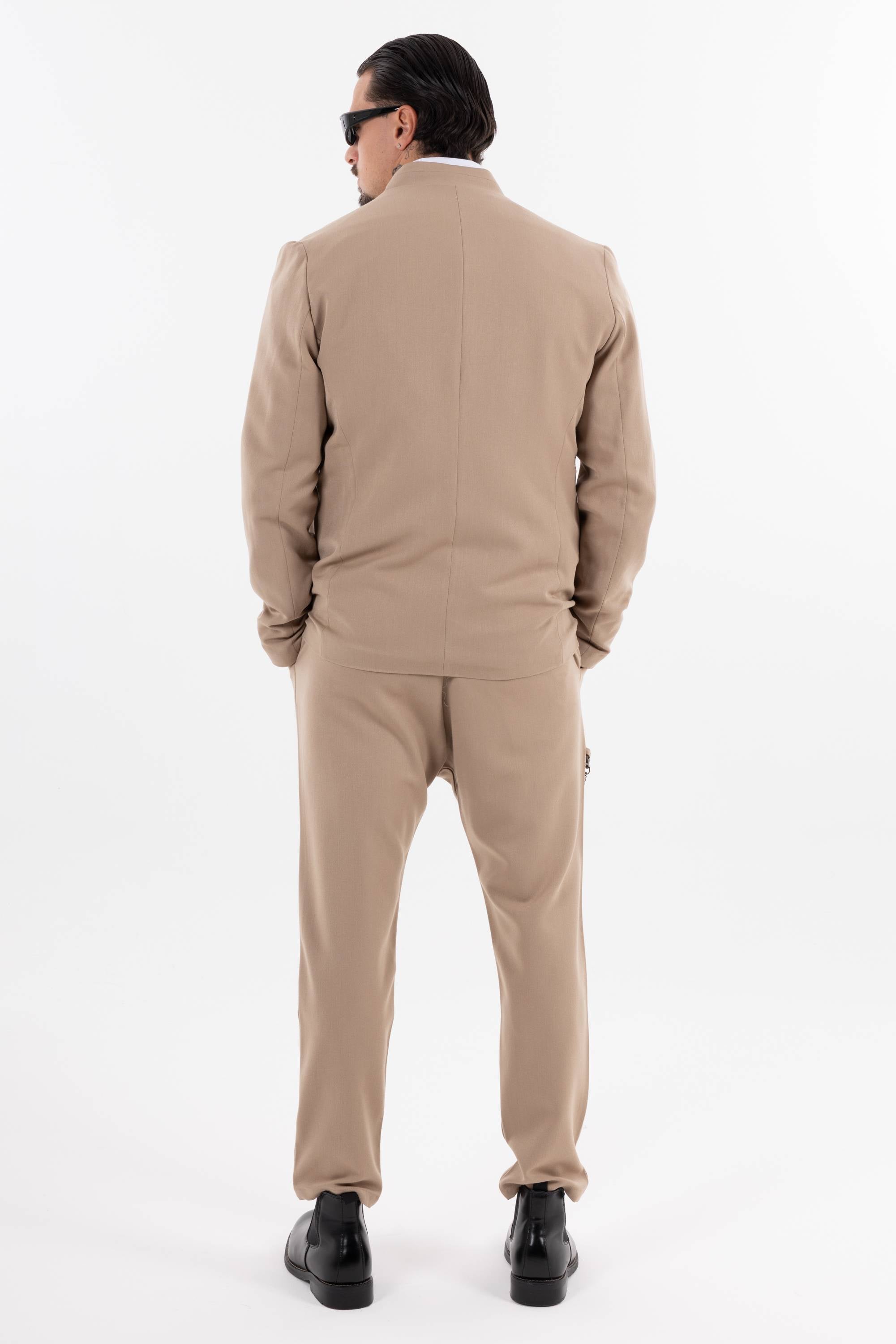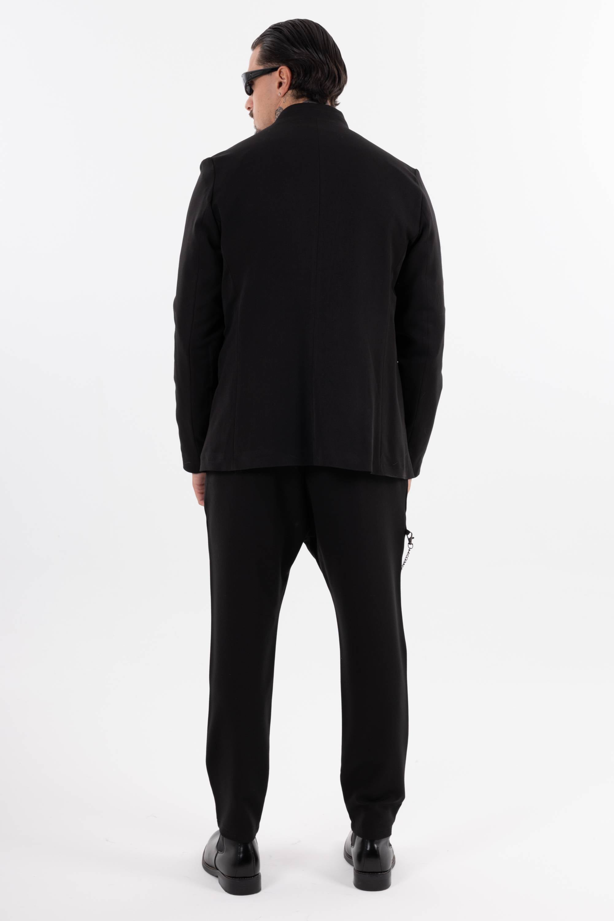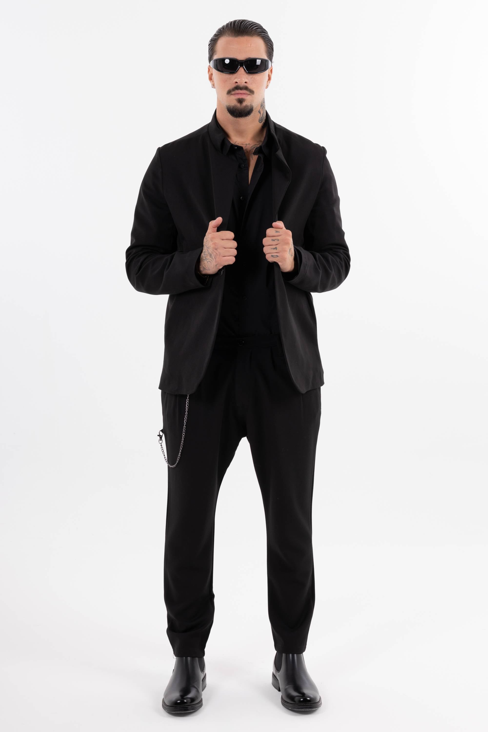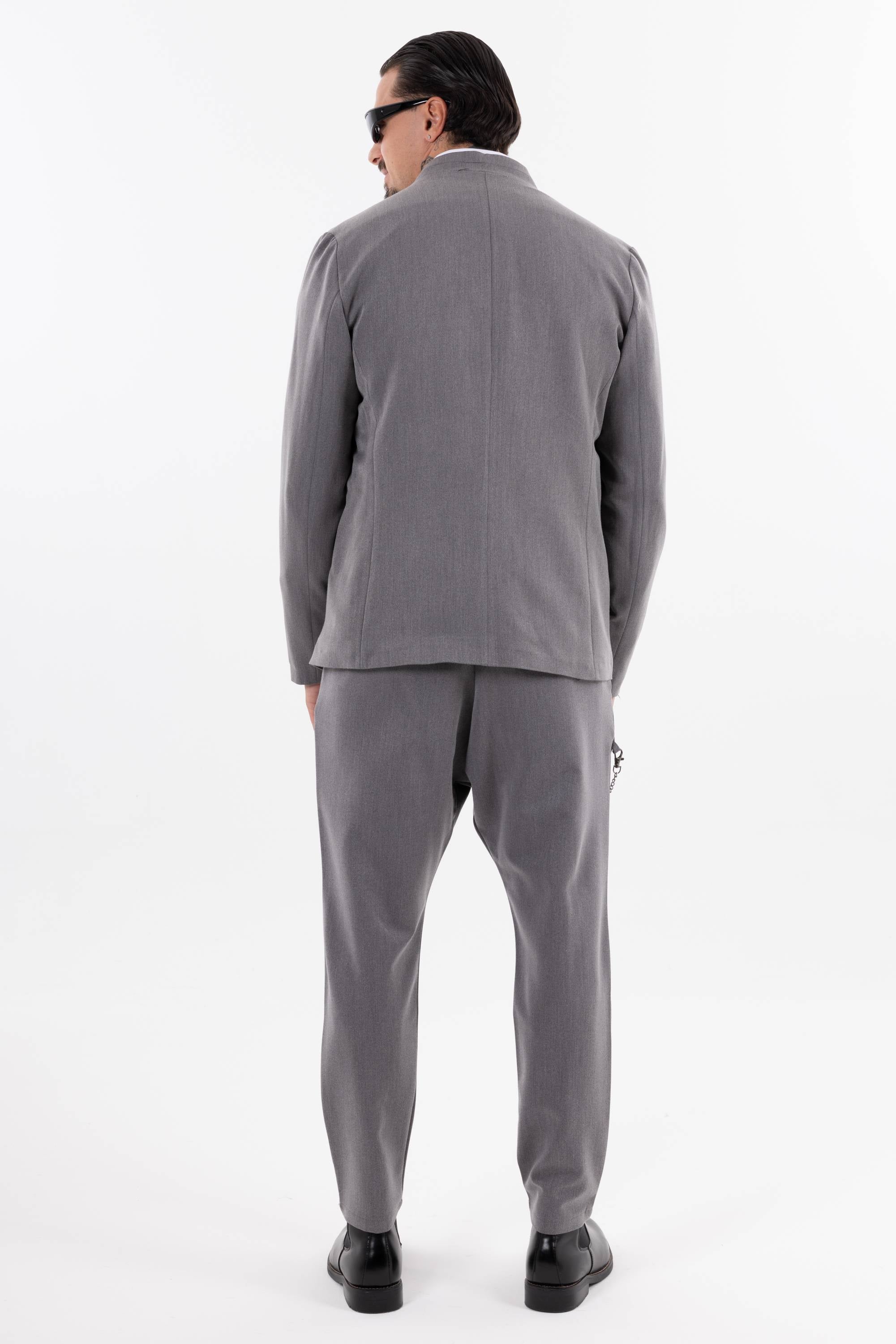 Pantaloni casual con pinces frontali e catena decorativa laterale che aggiunge un dettaglio urban. Risvolto alla caviglia e taglio morbido per unire stile e comfort. Disponibile giacca coordinabile.