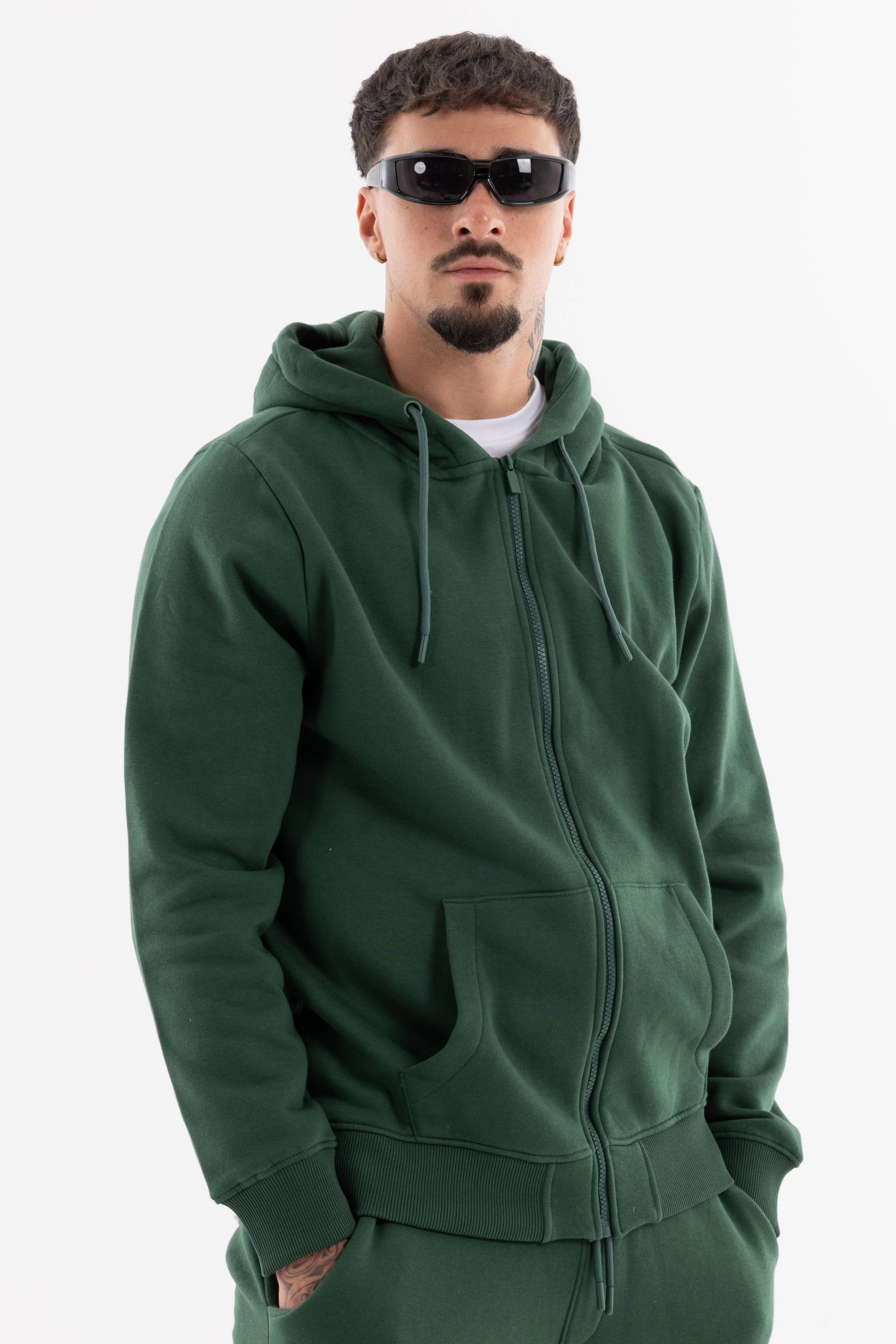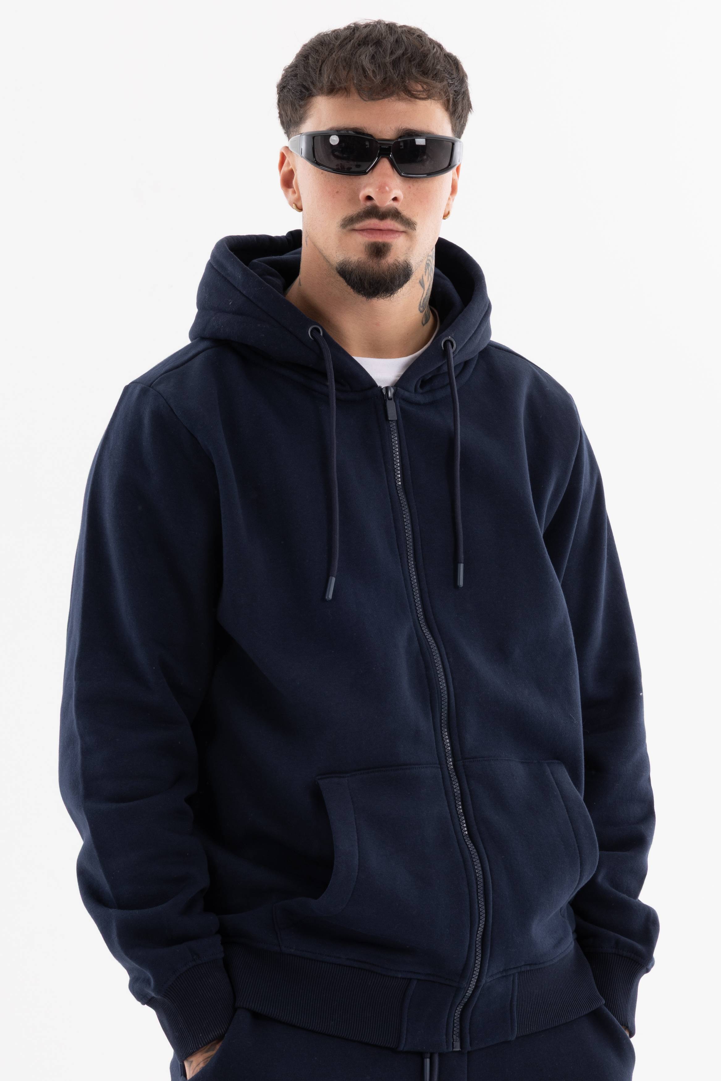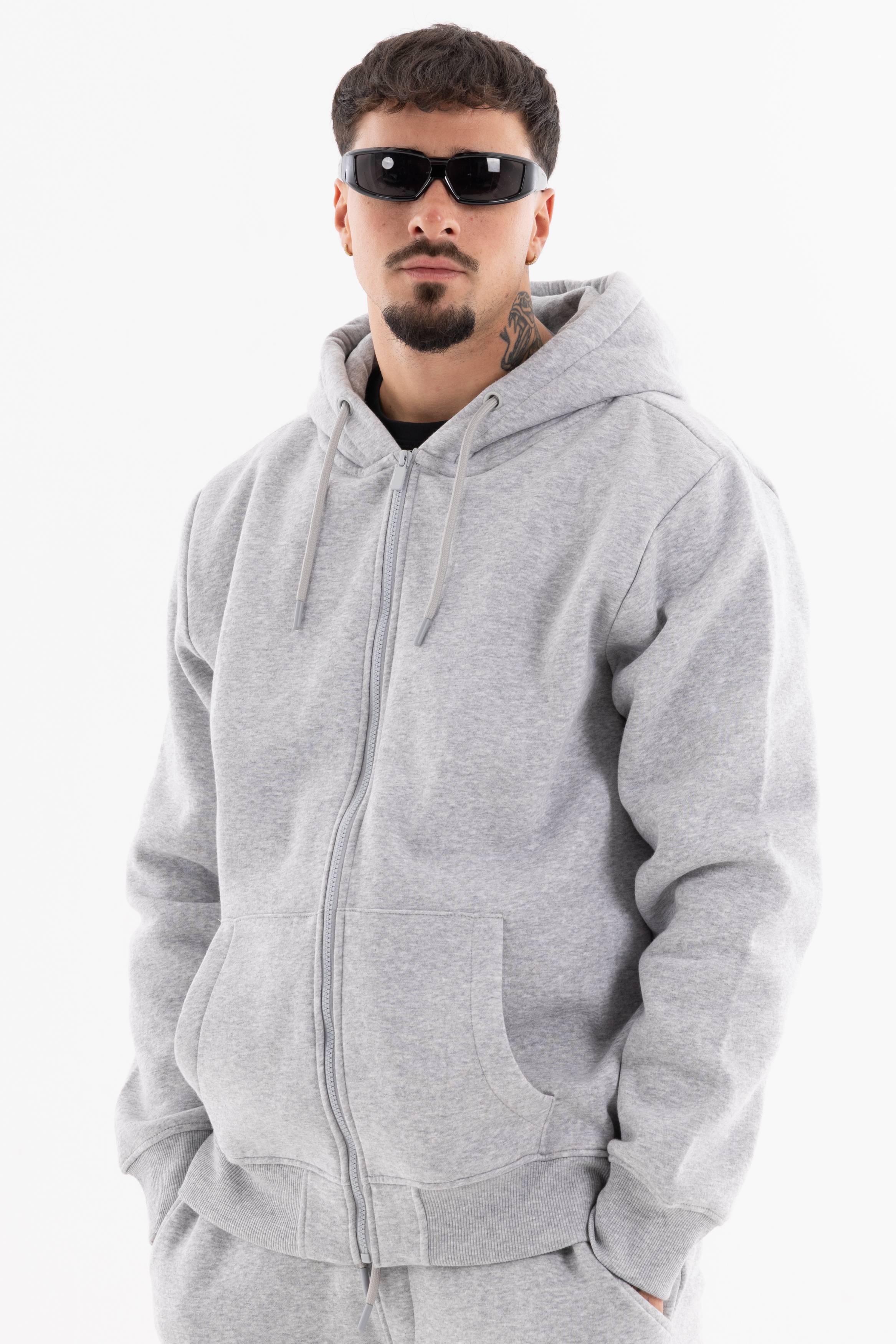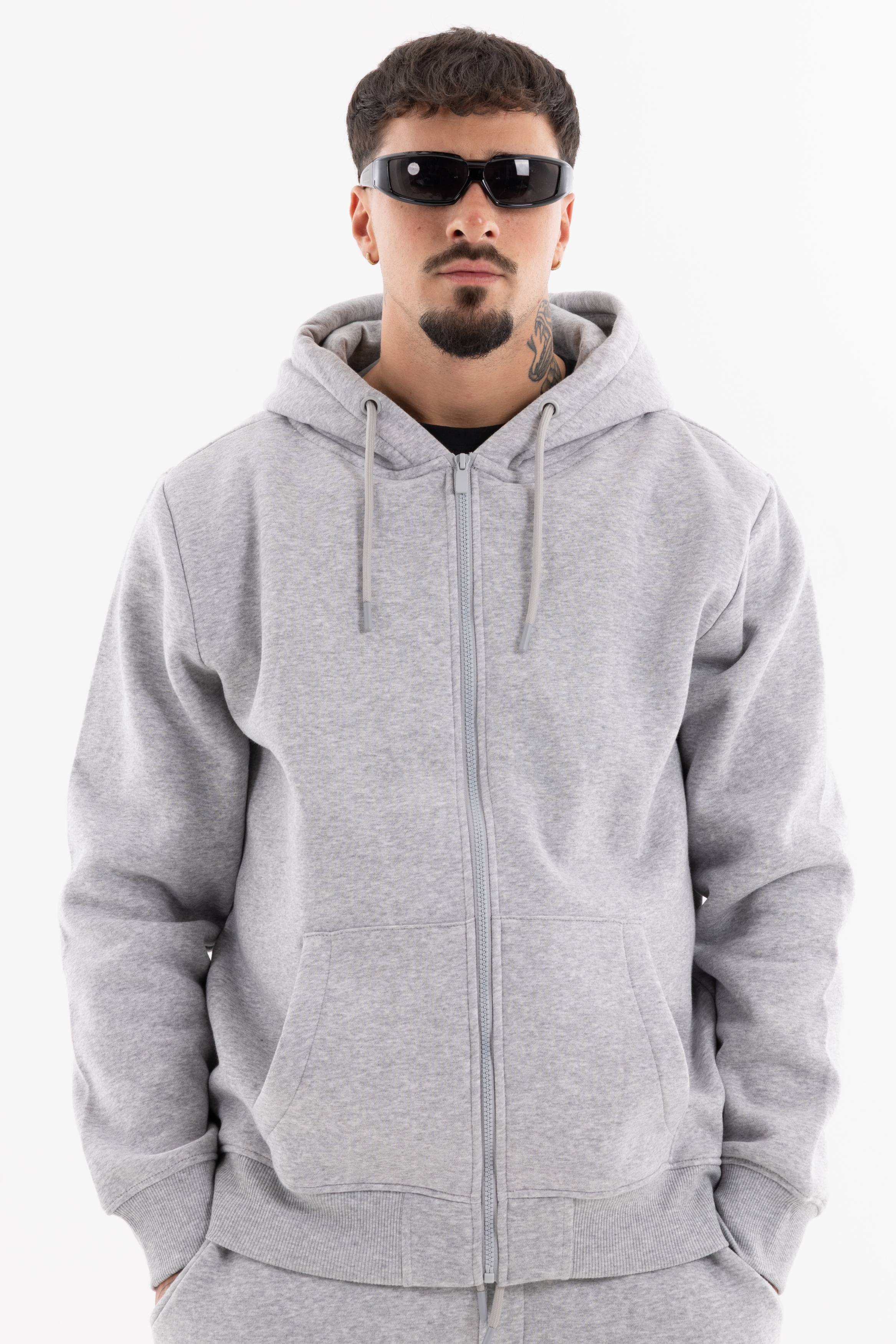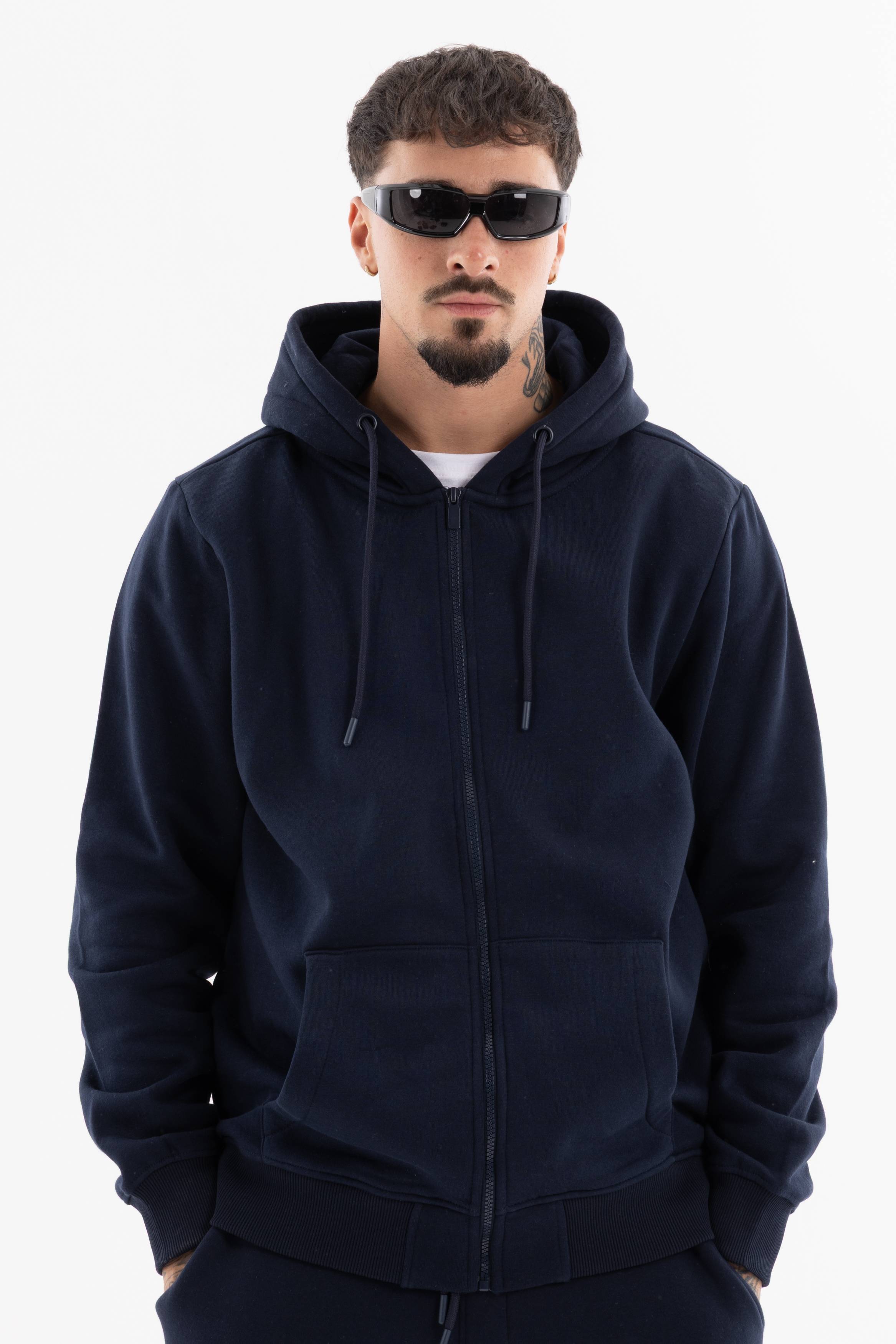 Felpa uomo basic con cappuccio e chiusura con zip. Capo versatile e leggero ideale per un look casual dal design sportivo. Disponibili joggers coordinabili.