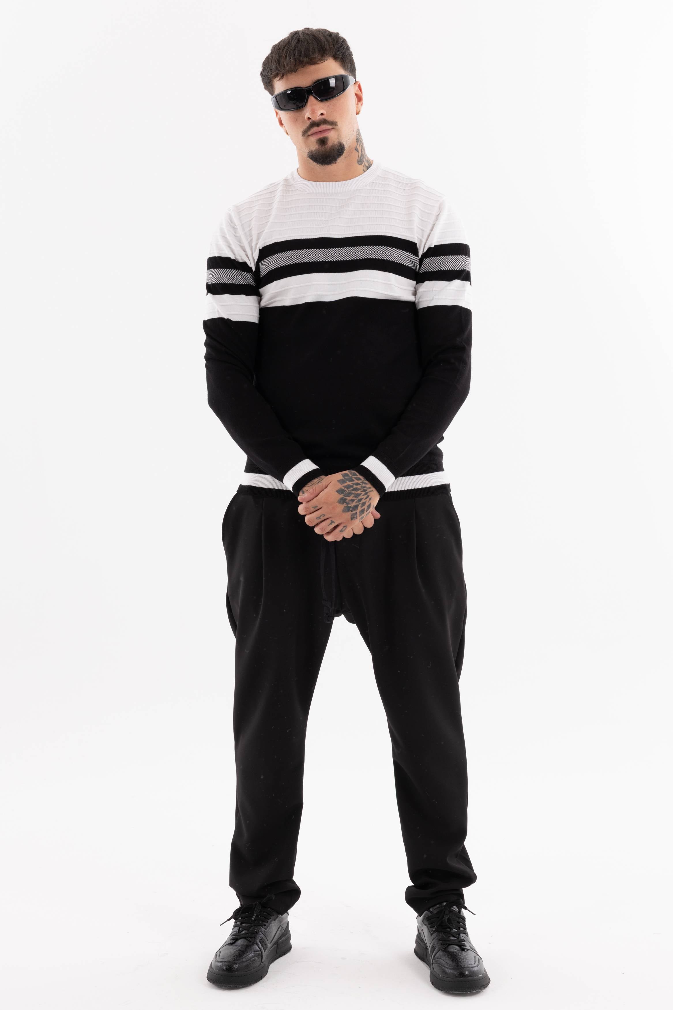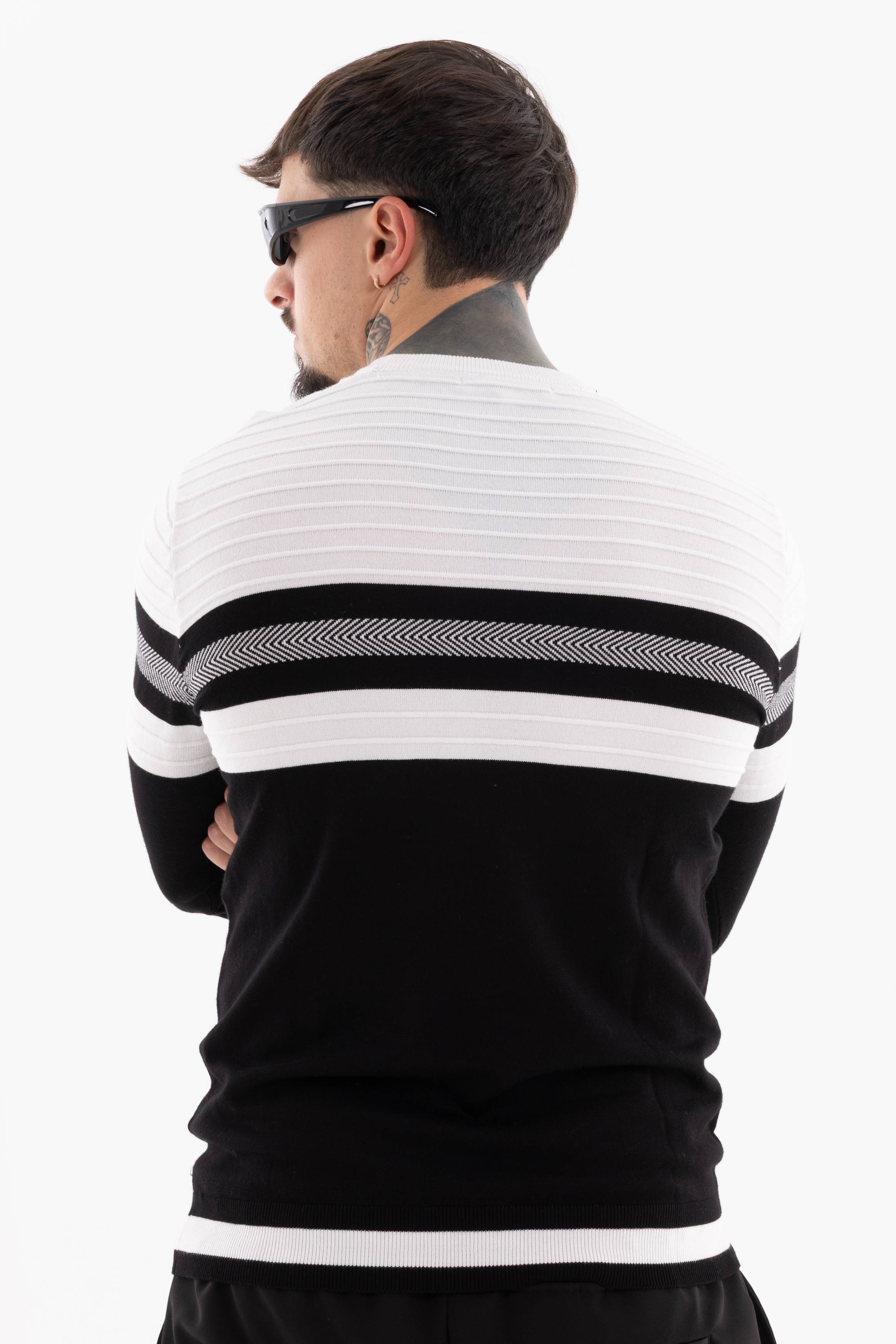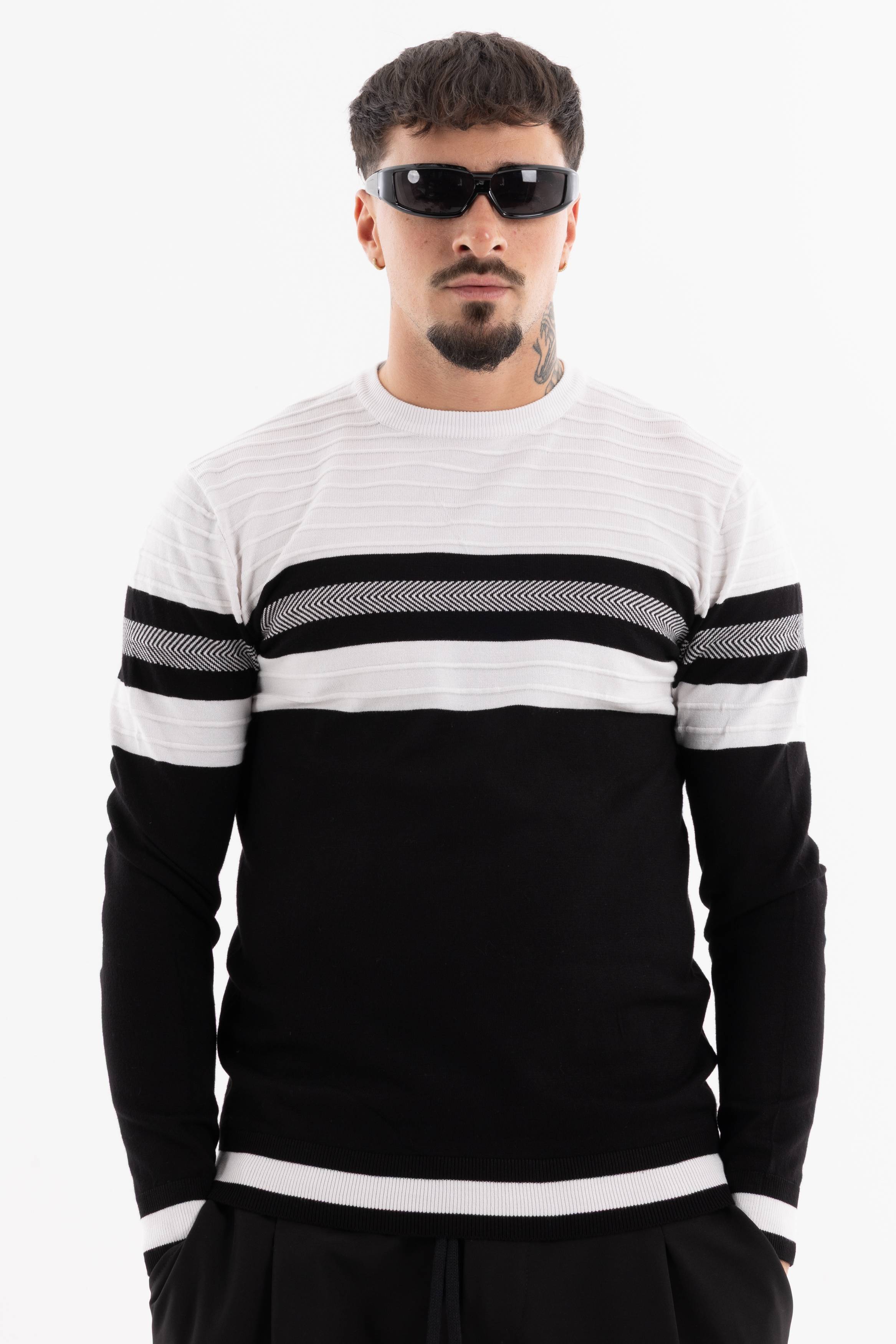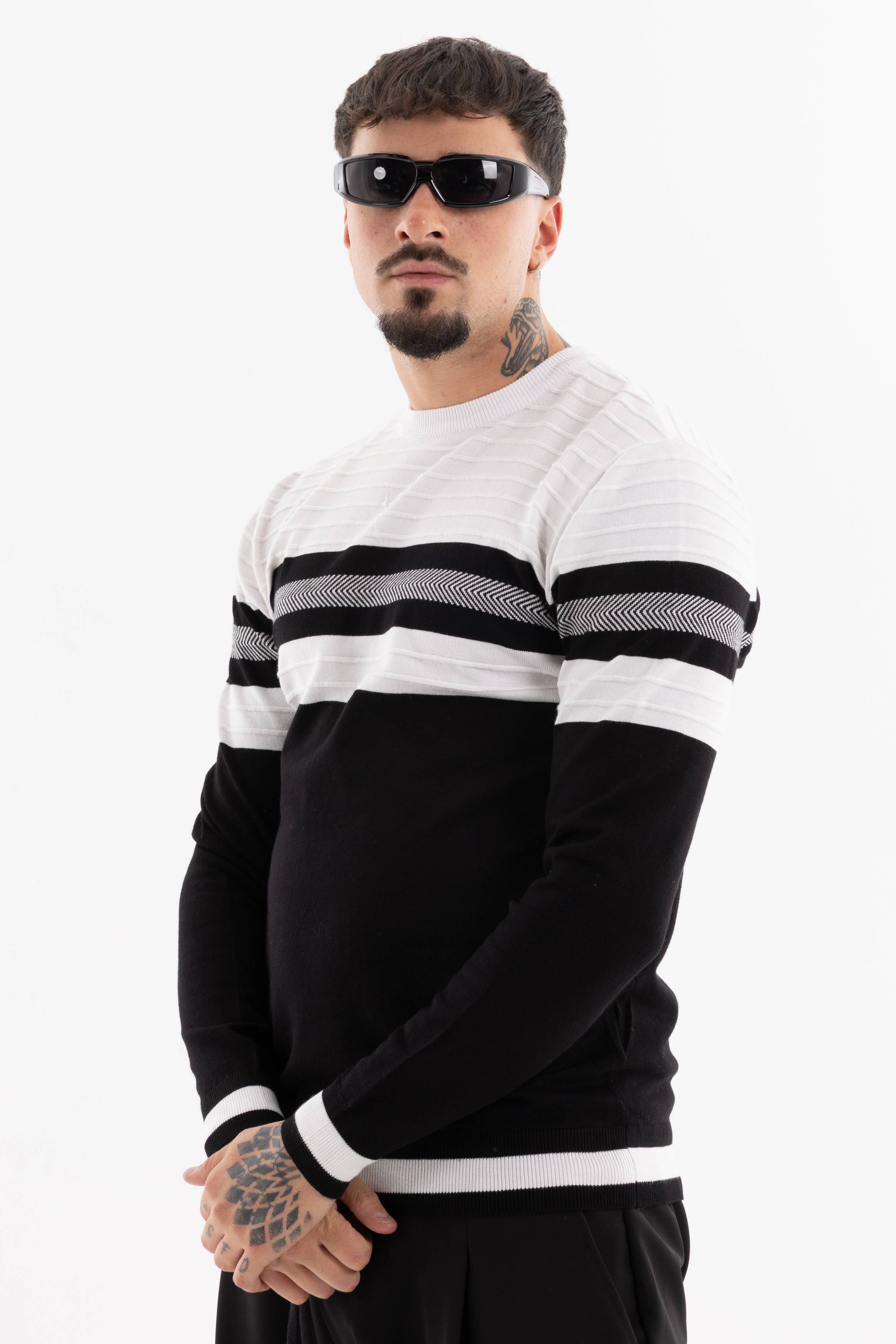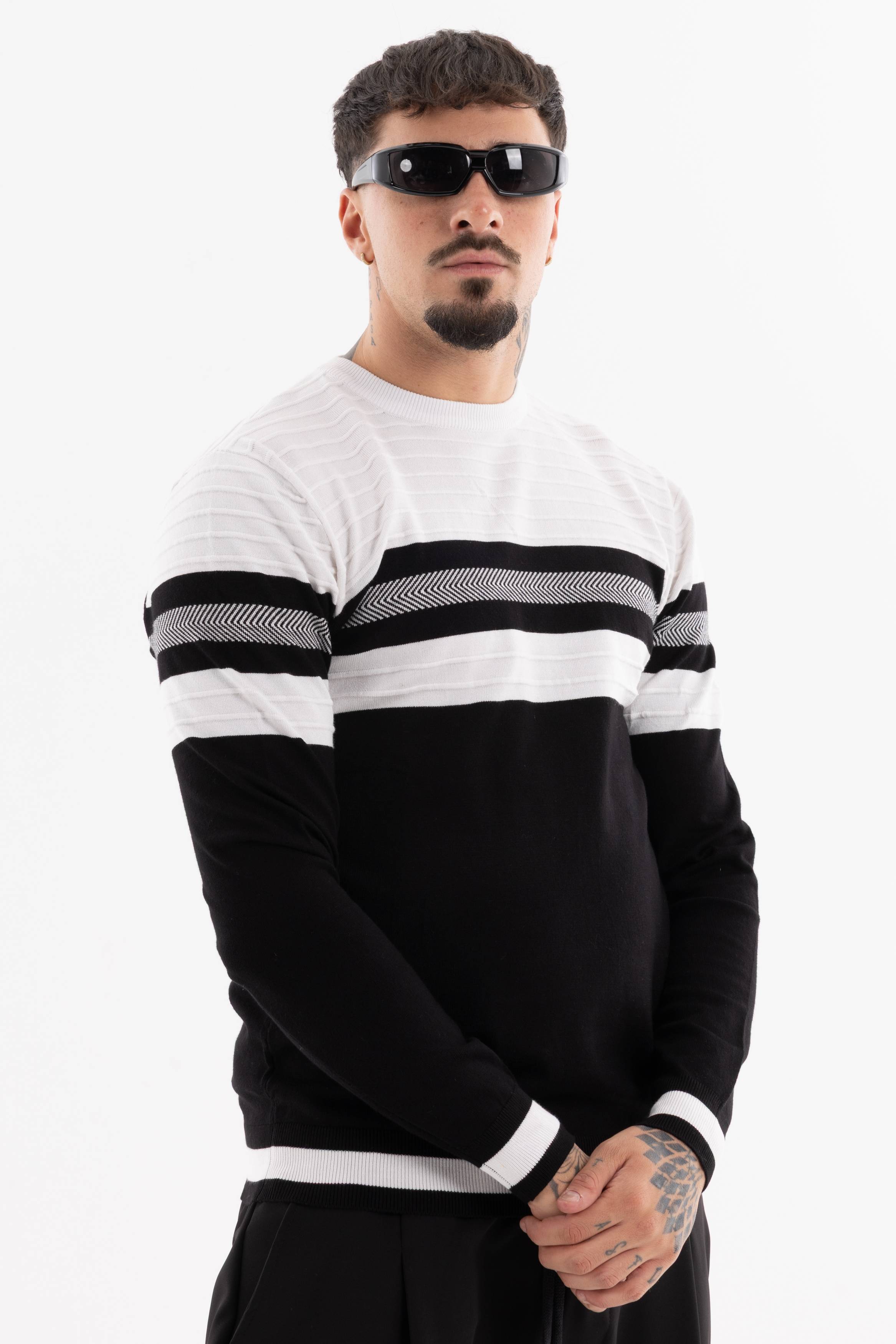 Maglioncino uomo color block con dettagli a righe dal design moderno e dinamico. Capo versatile e morbido ideale per valorizzare con stile un look quotidiano.