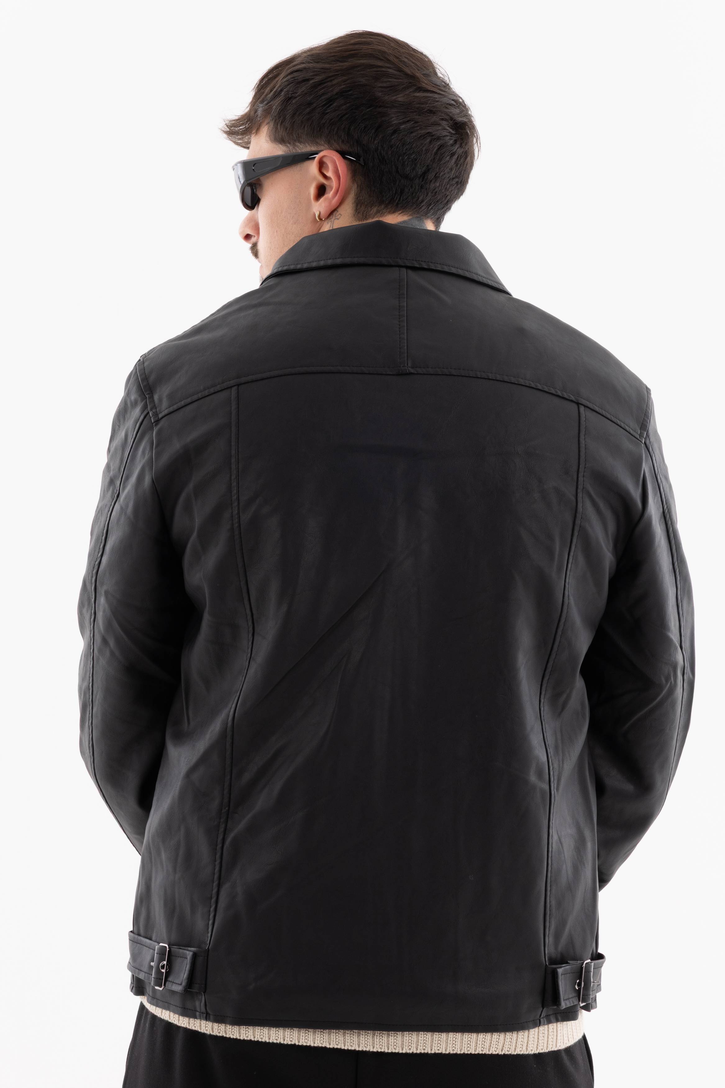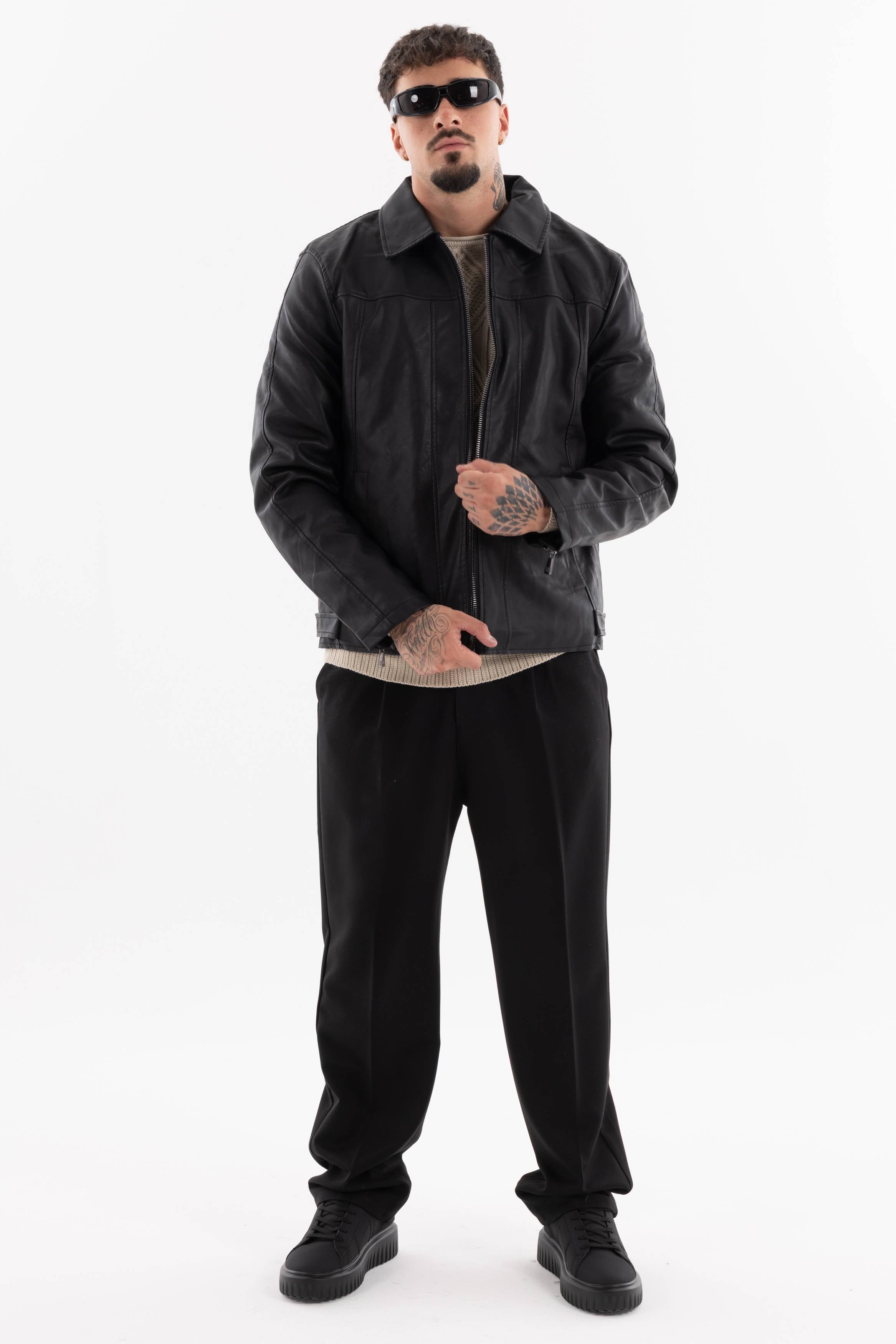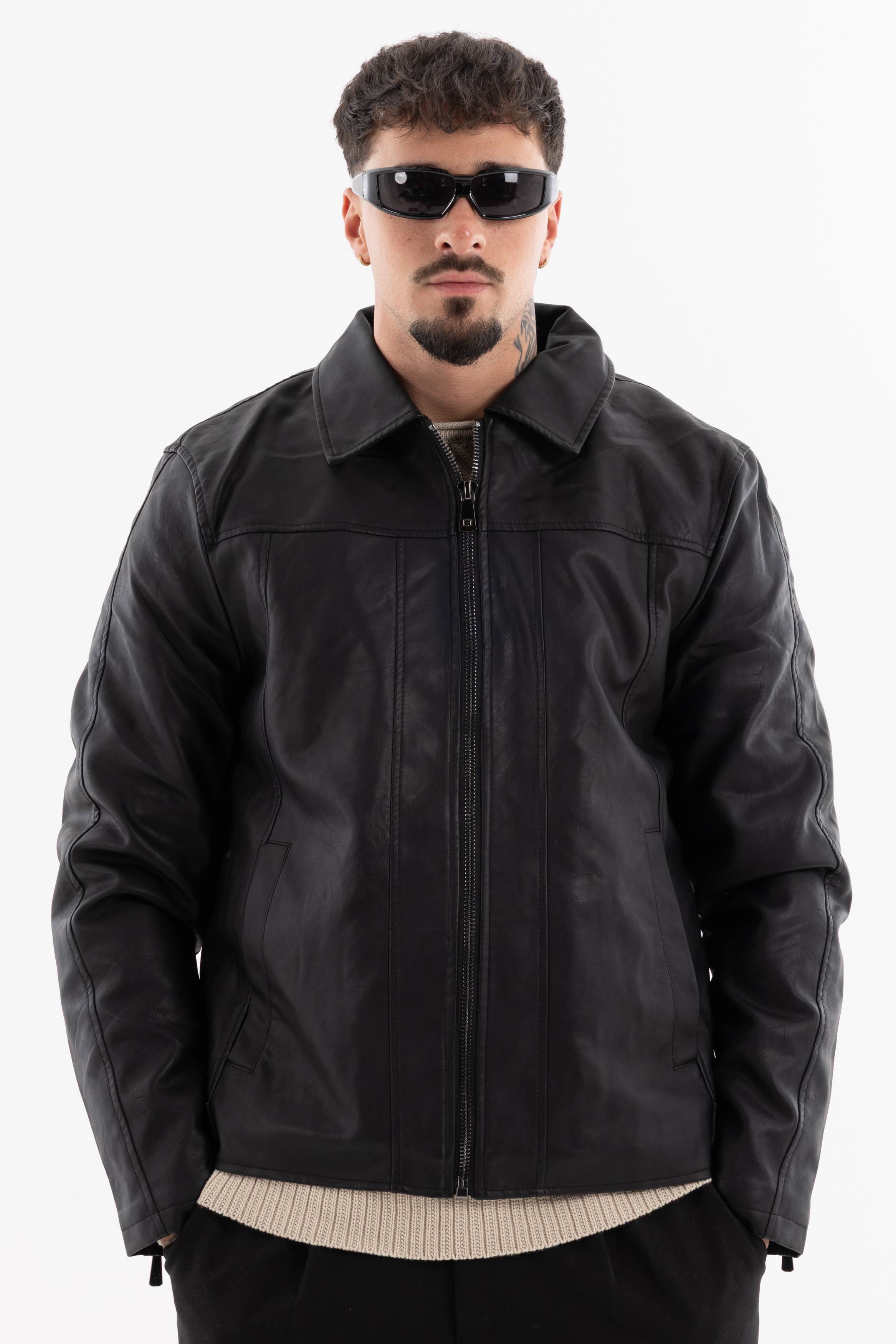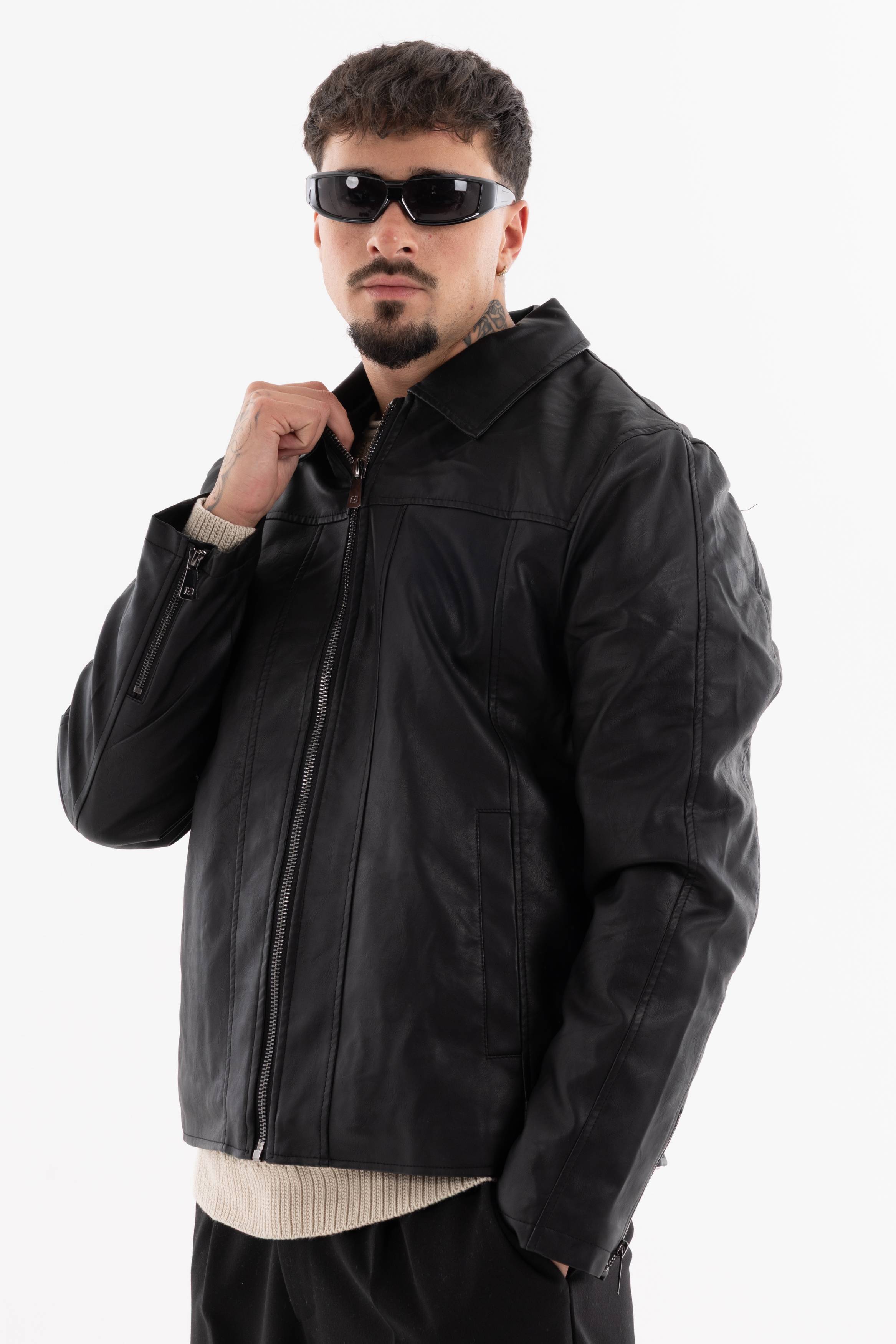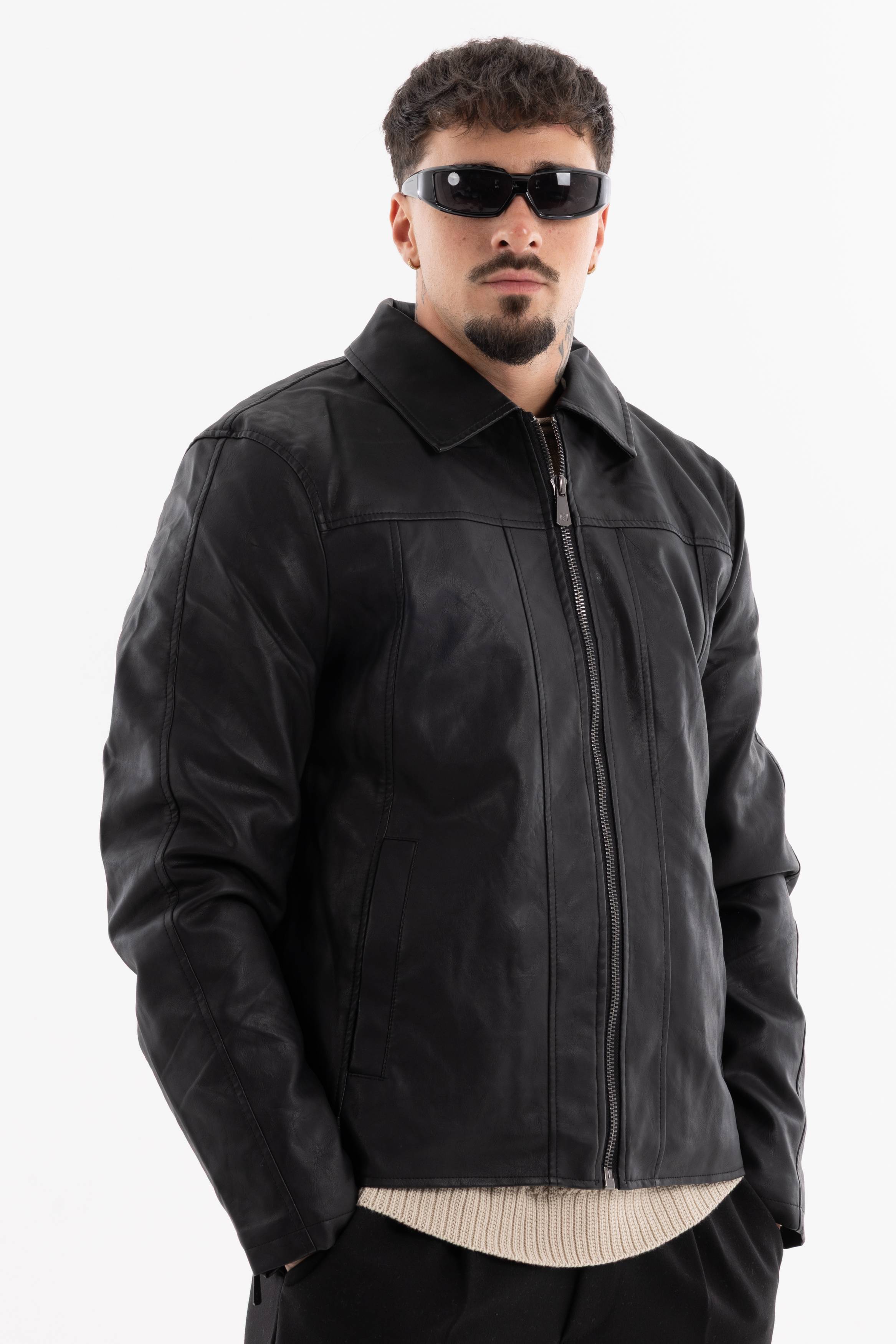Giubbotto uomo effetto pelle con collo regular dal design classico e linee essenziali. Capo versatile e perfetto per completare con stile un look urbano e moderno.
