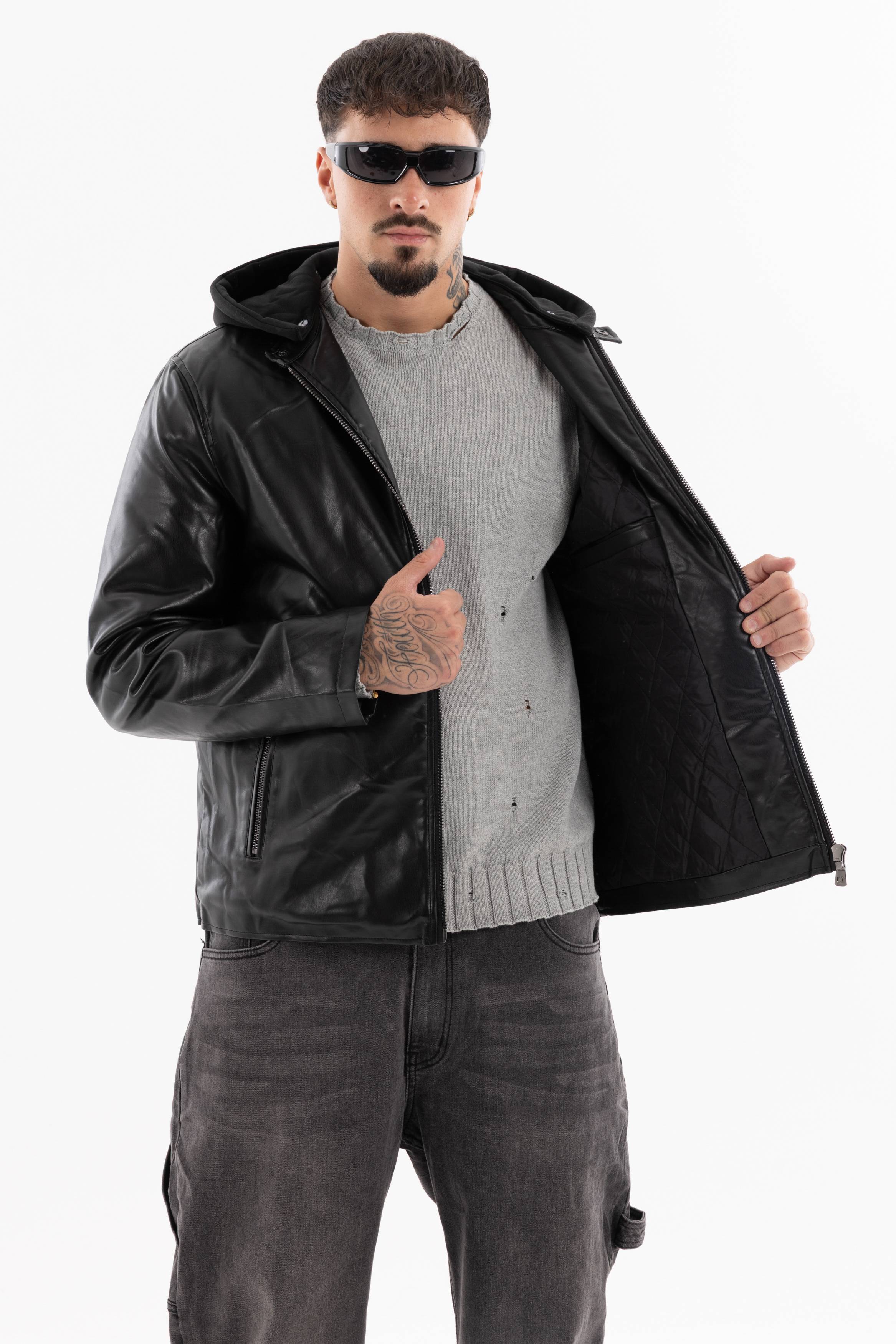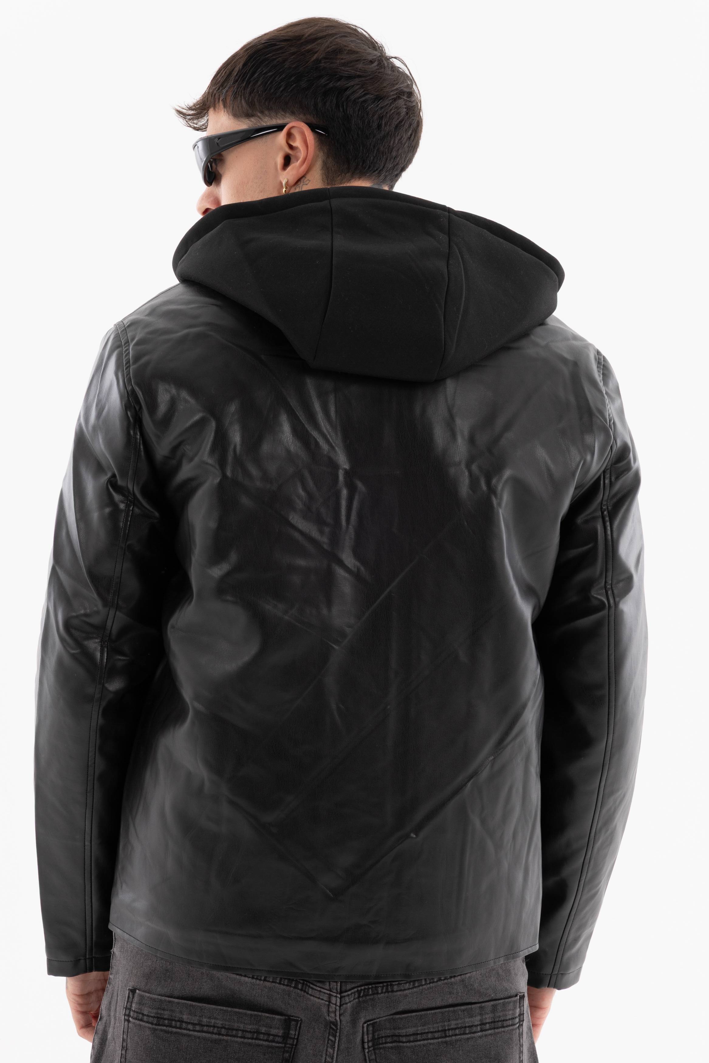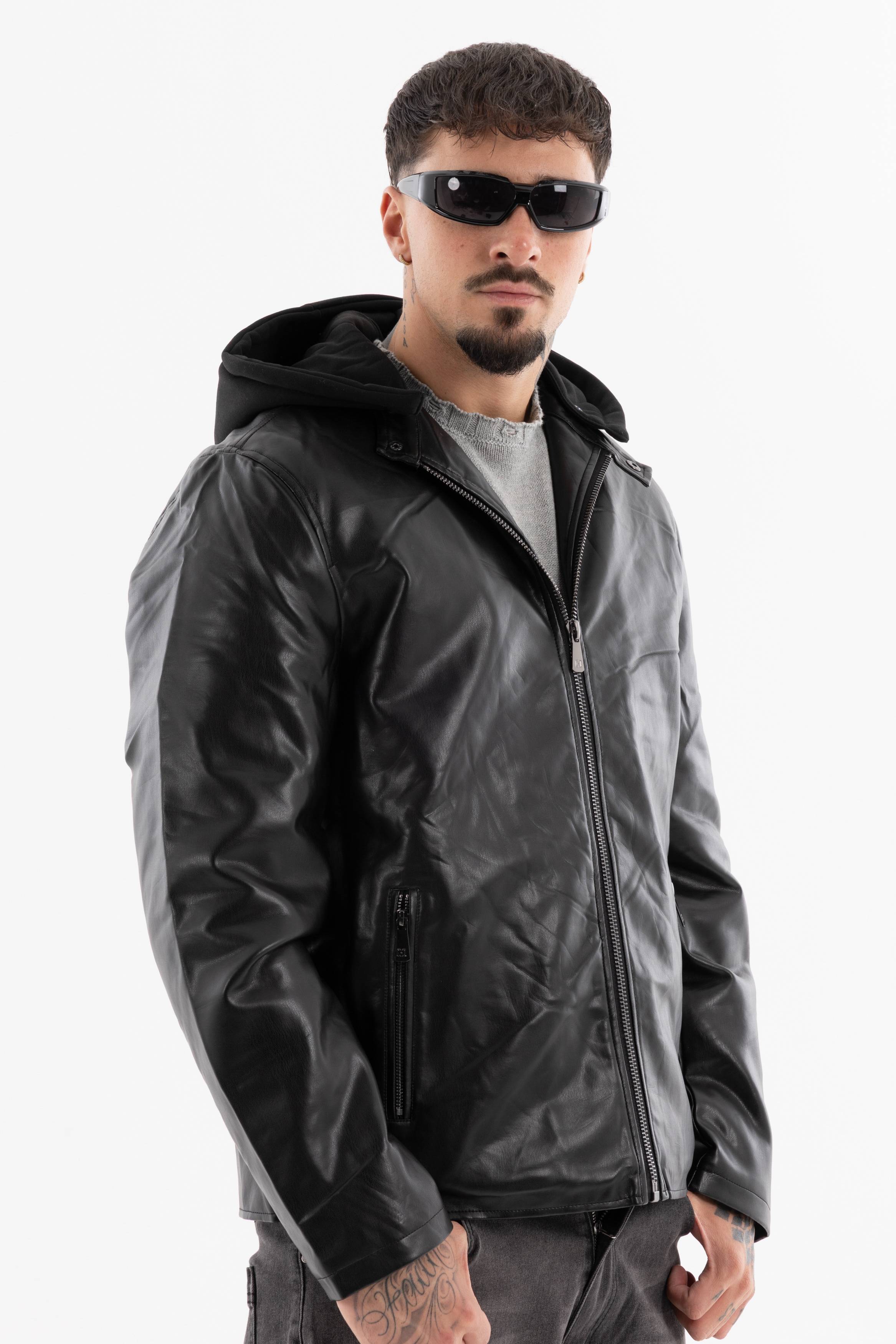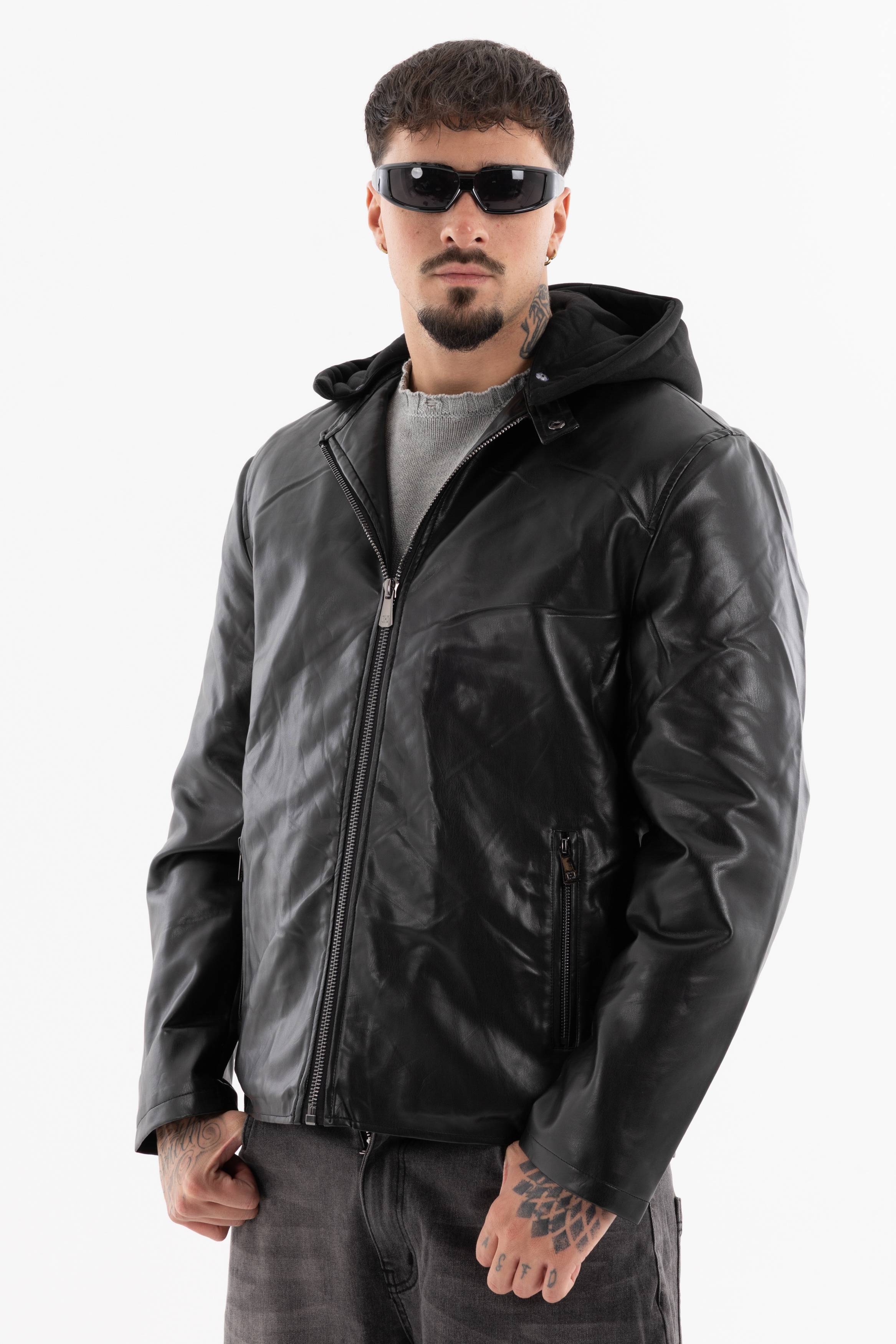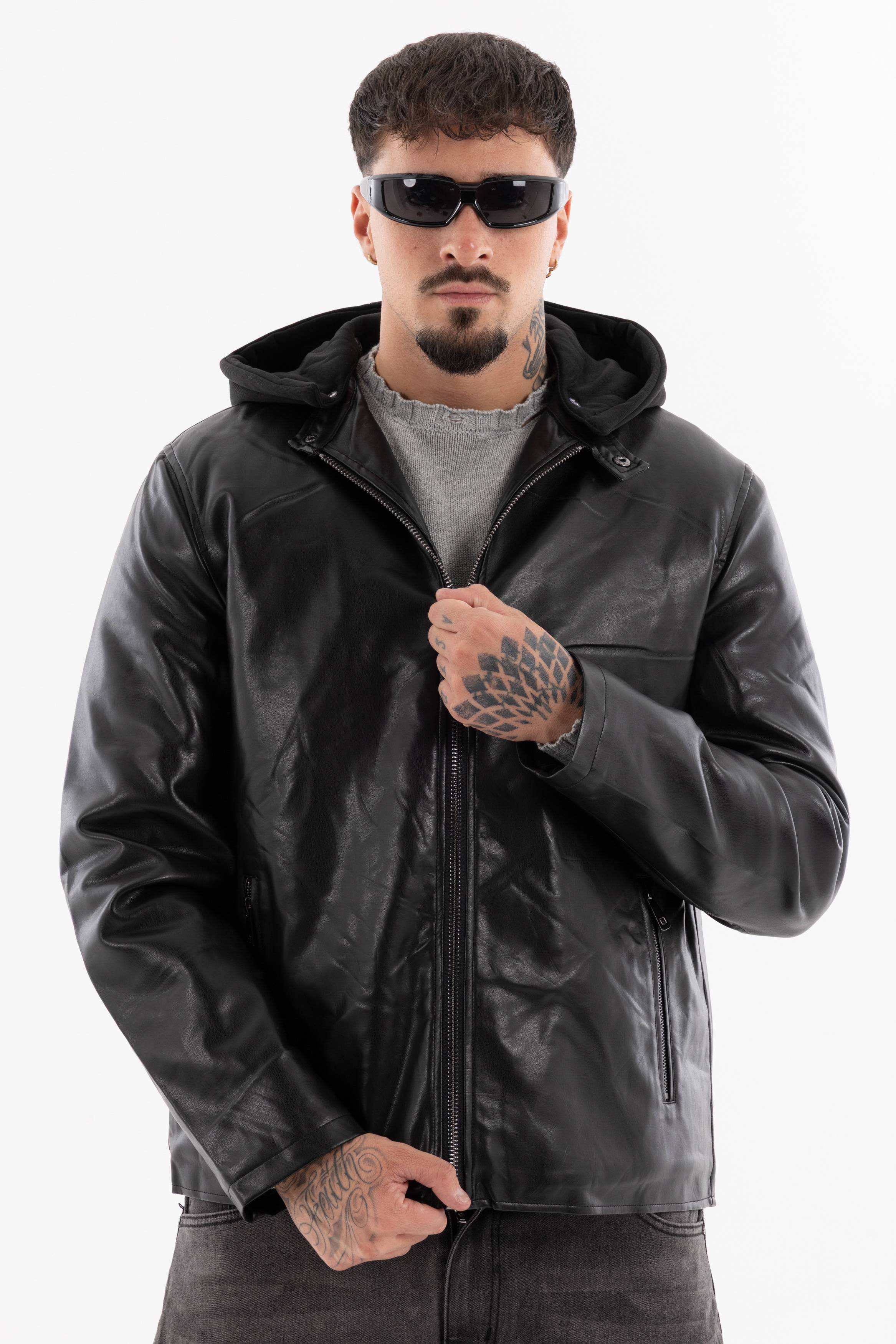 Giubbotto uomo effetto pelle con cappuccio dallostile moderno e deciso. Linea smart e attuale uncapo urbano che dona carattere e stile a ogni look.