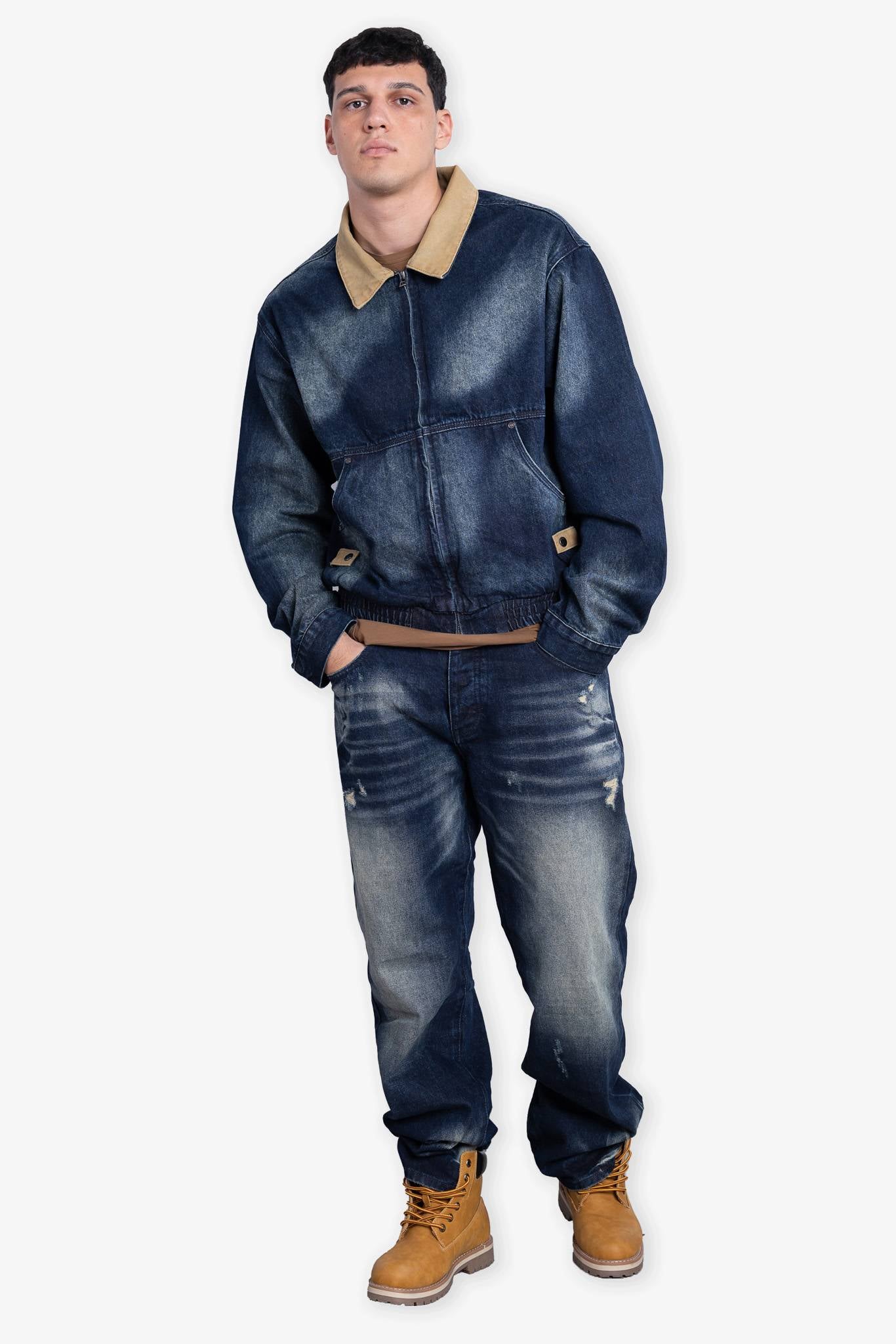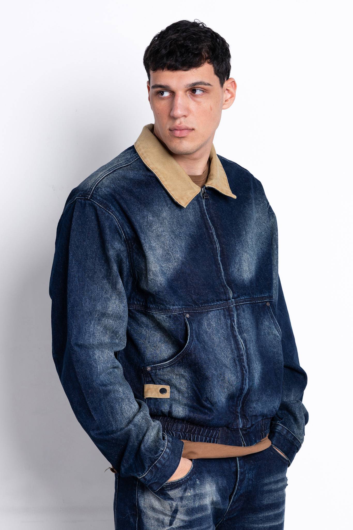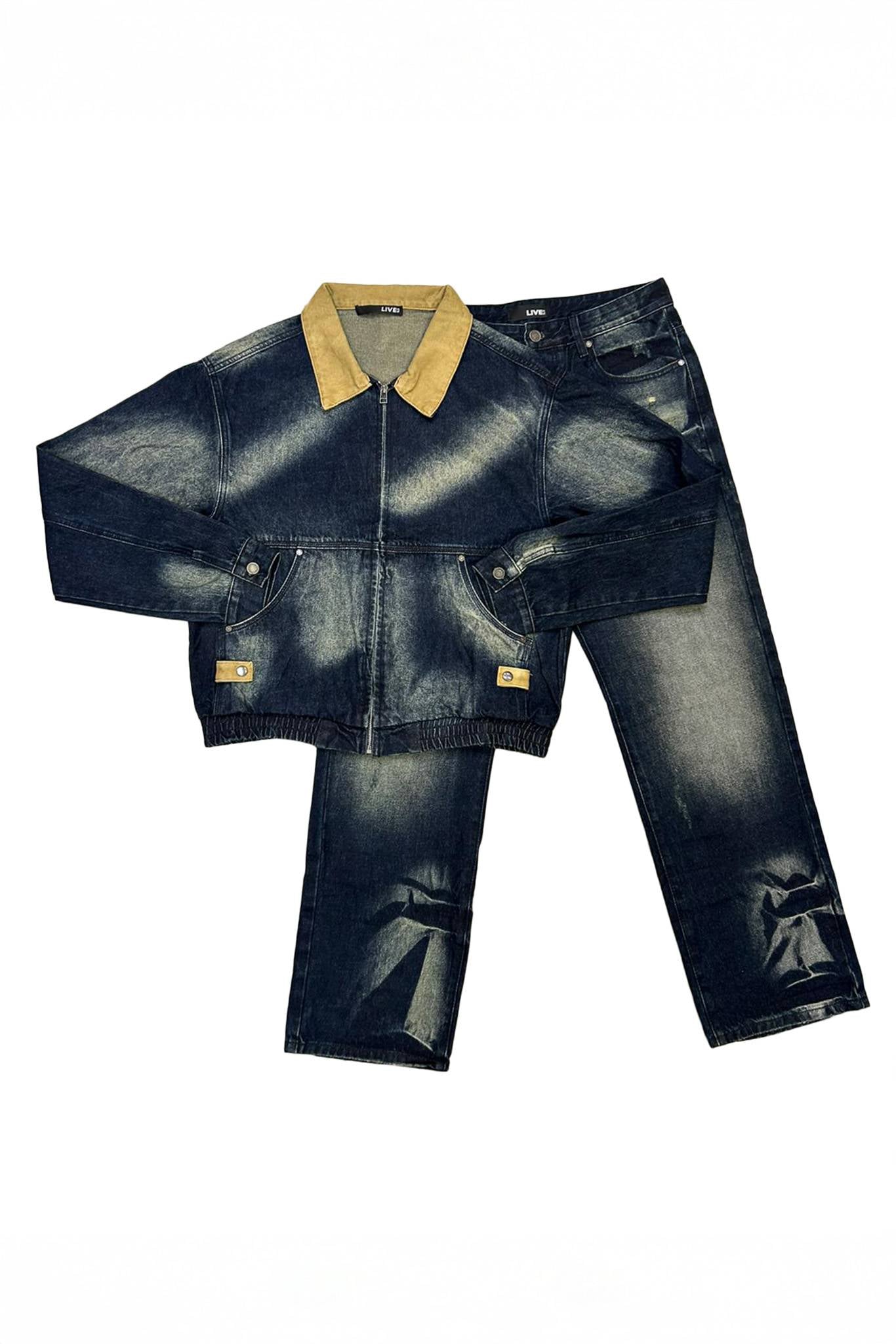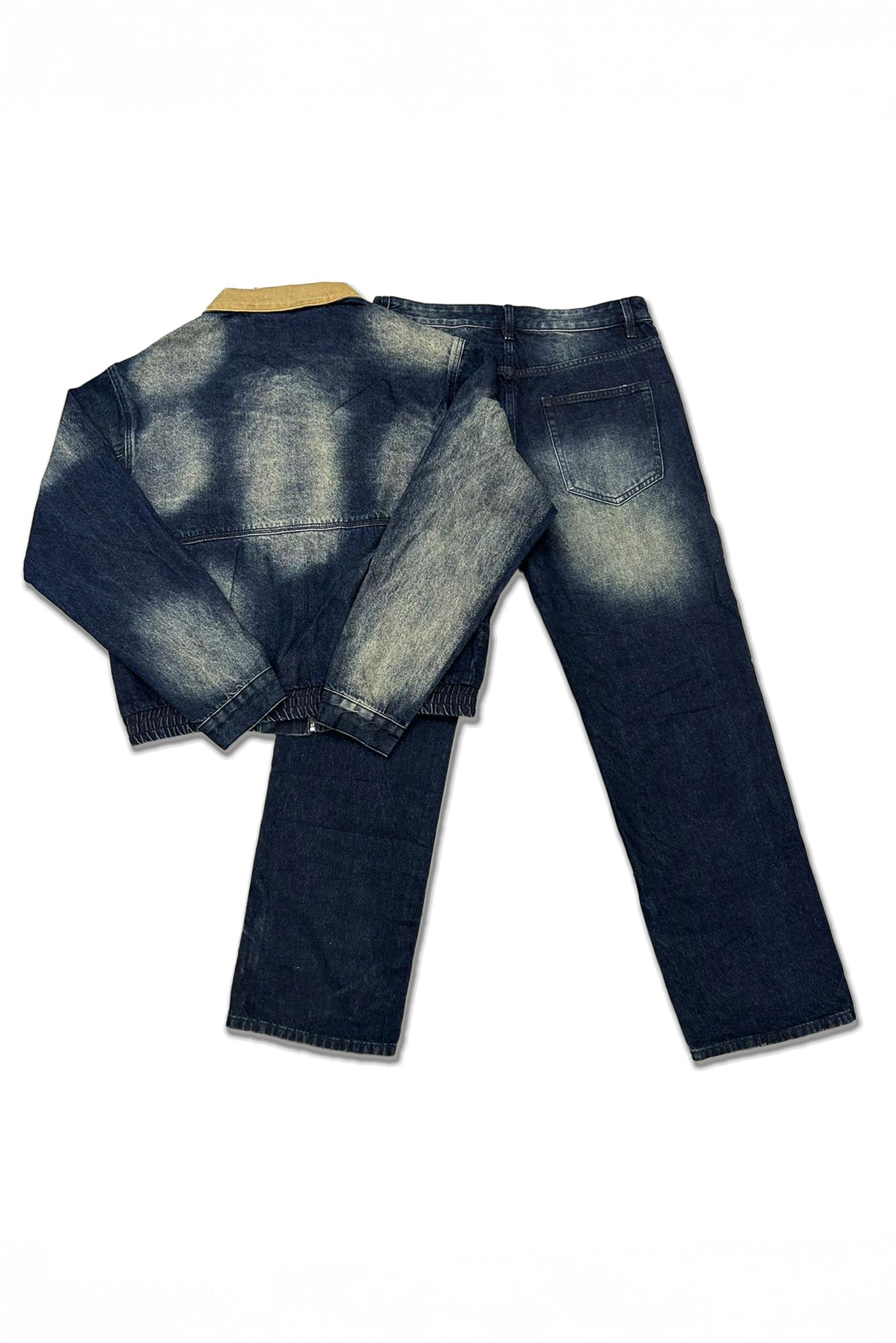 Completo uomo composto da camicia in denim con colletto a contrasto beige e tessuto jeans. Un coordinato dallo stile urban che regala intensità al look daily.