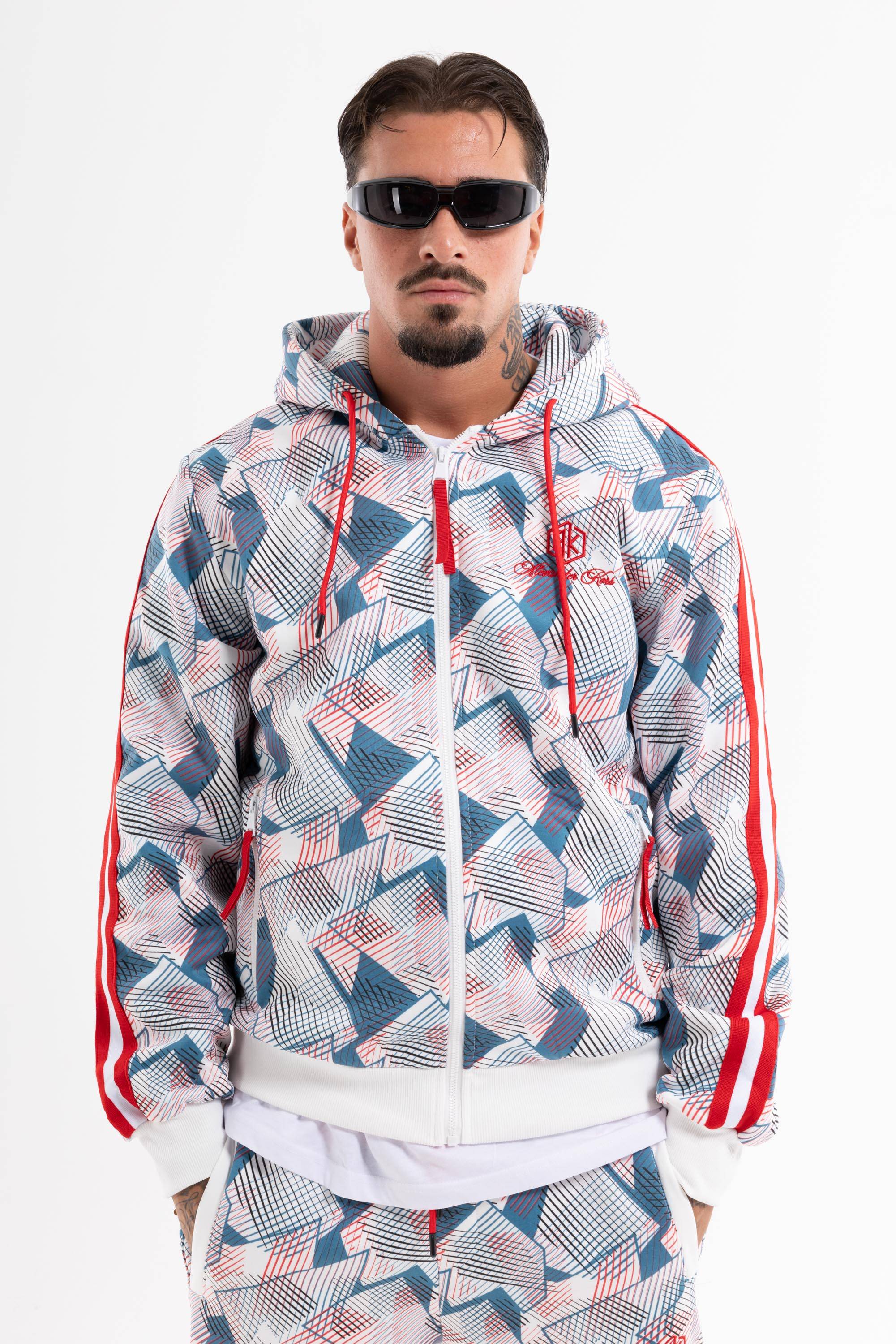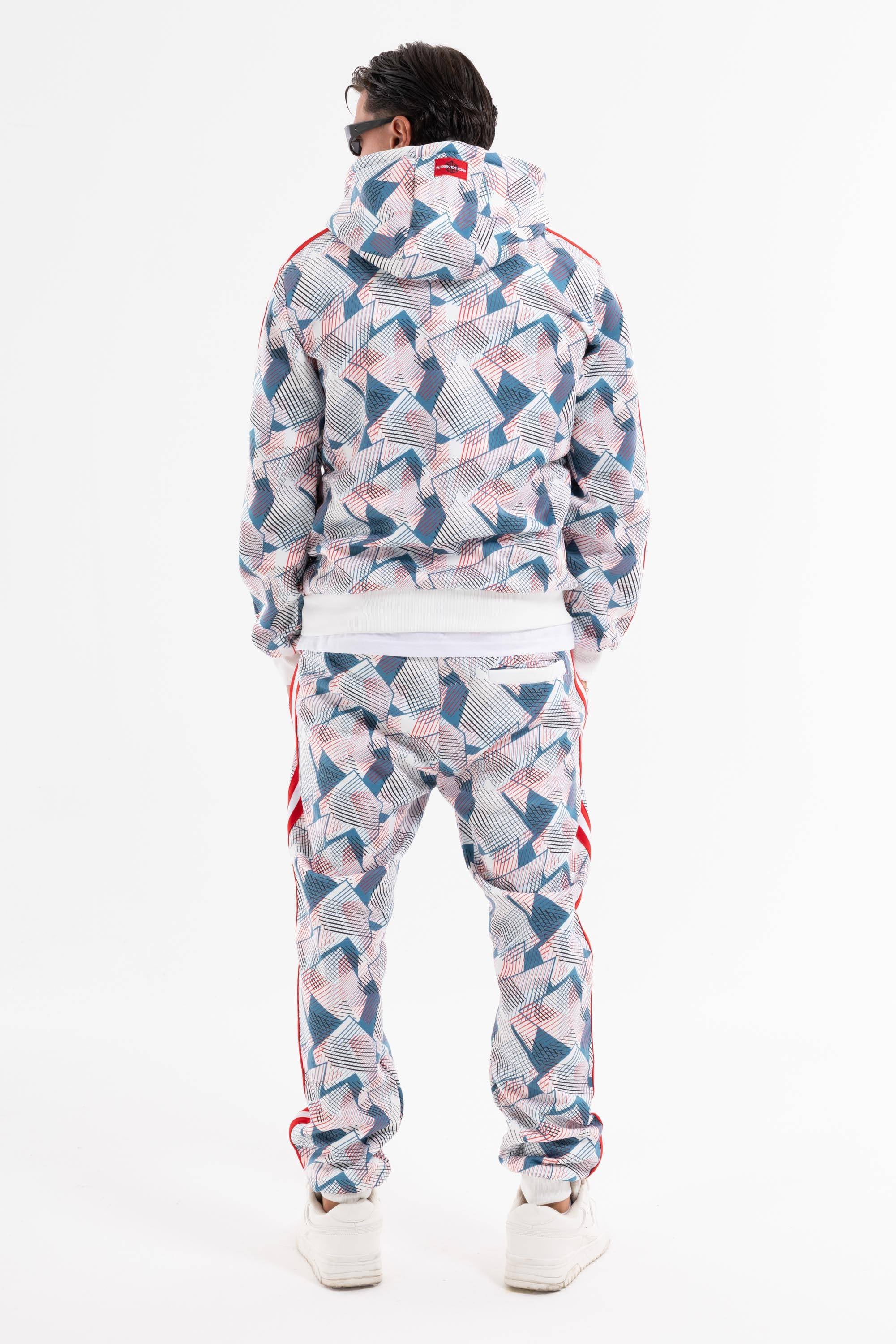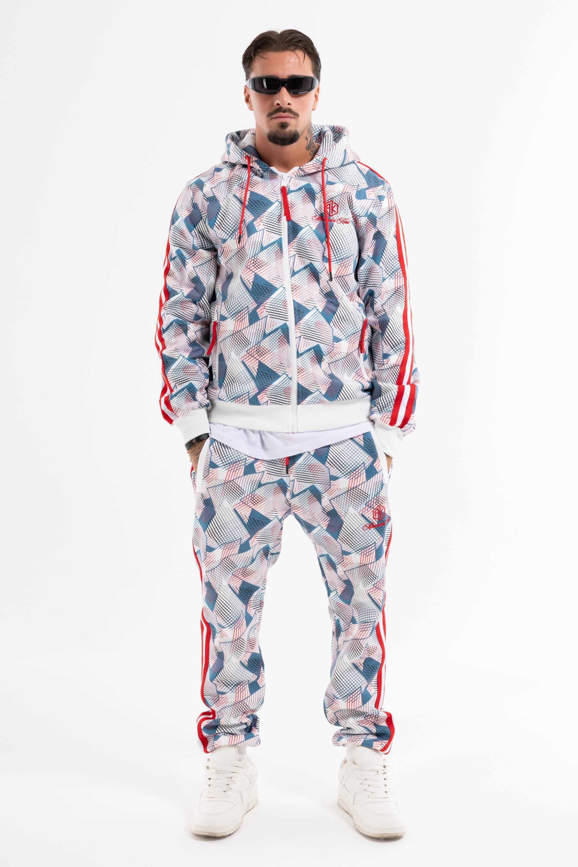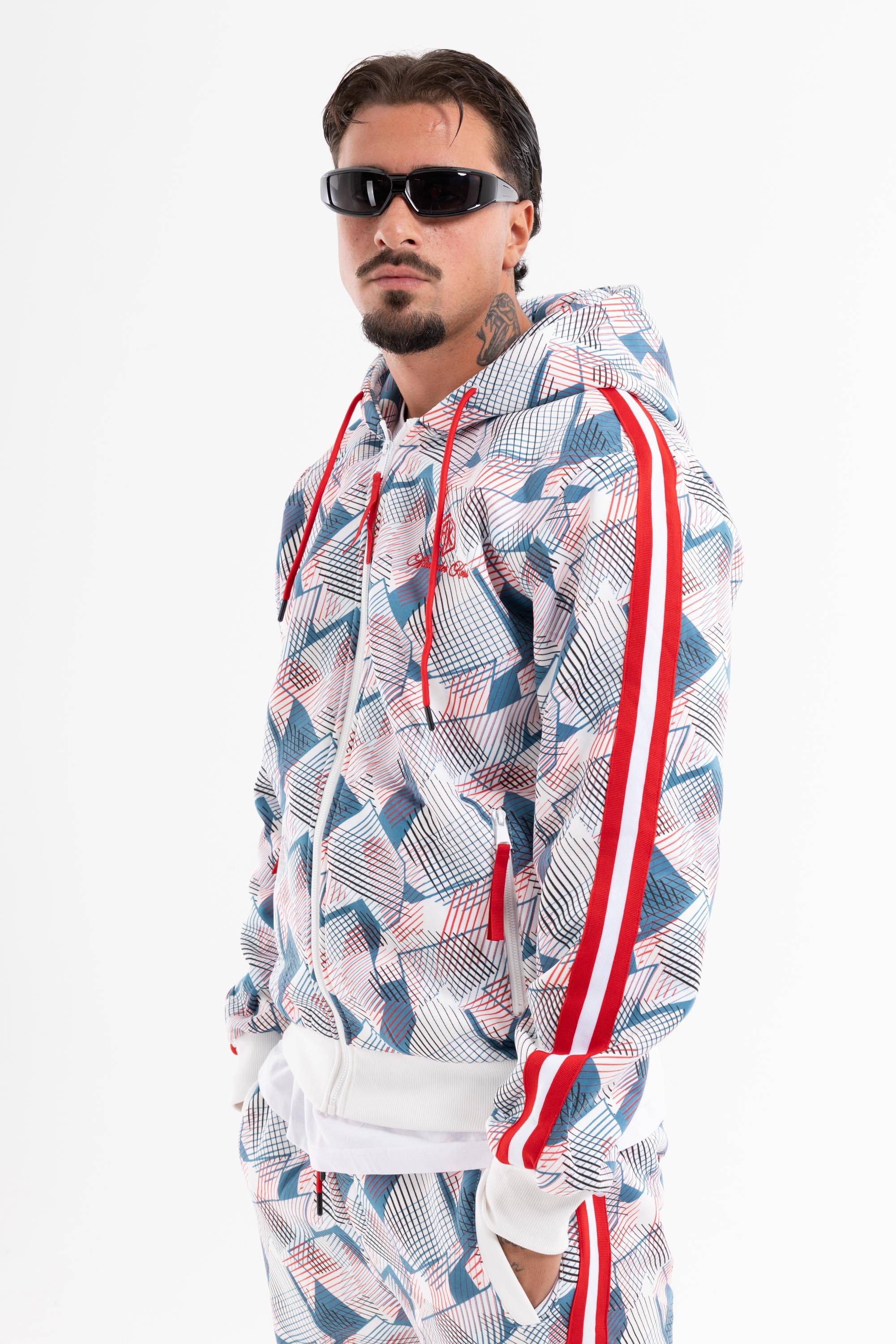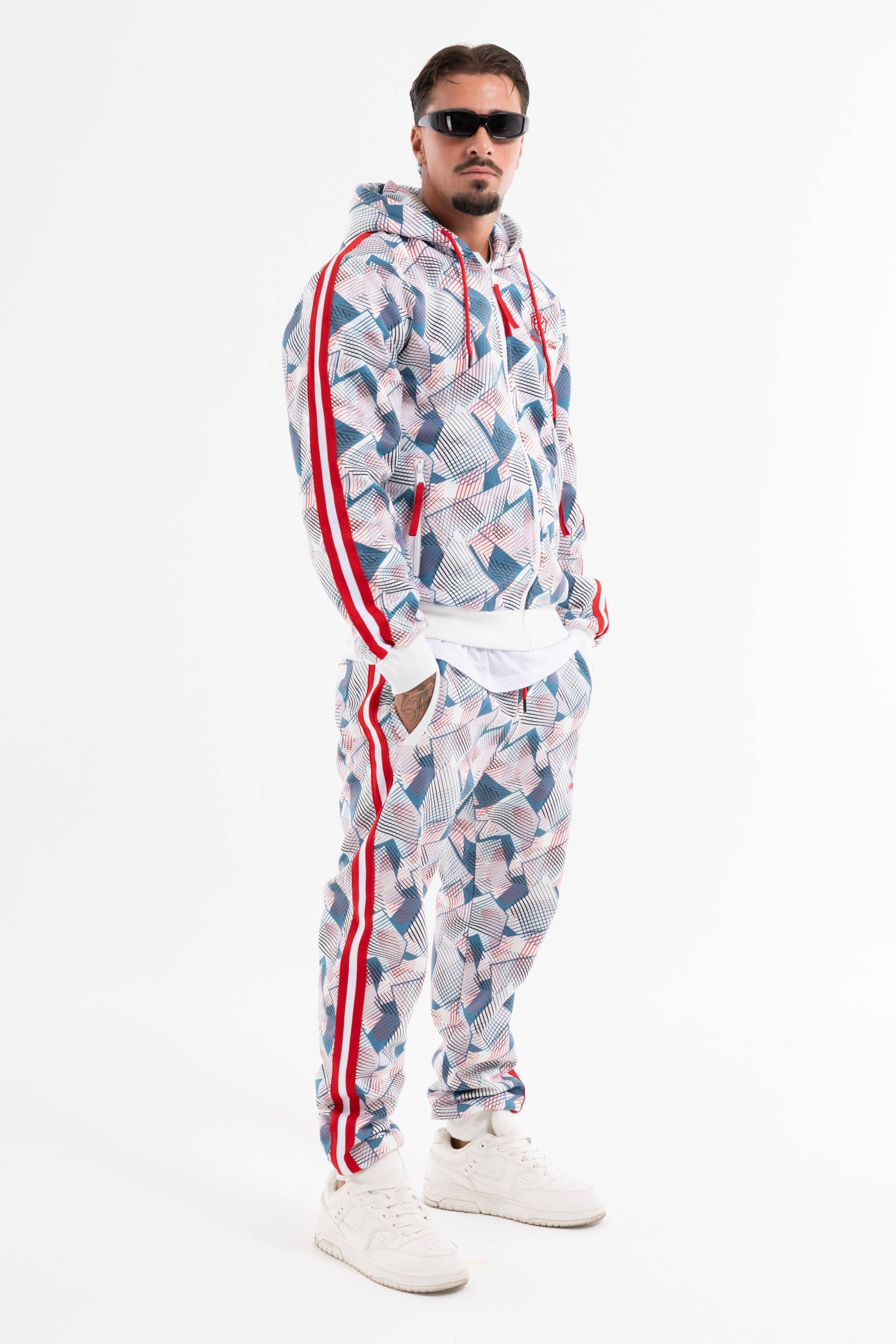 Tuta dallo stile originale e sportivo perfetta per il tempo libero.Pattern geometrico con dettagli acontrasto logo su petto e gamba felpa con zip ecappuccio polsini e caviglie elasticizzati.