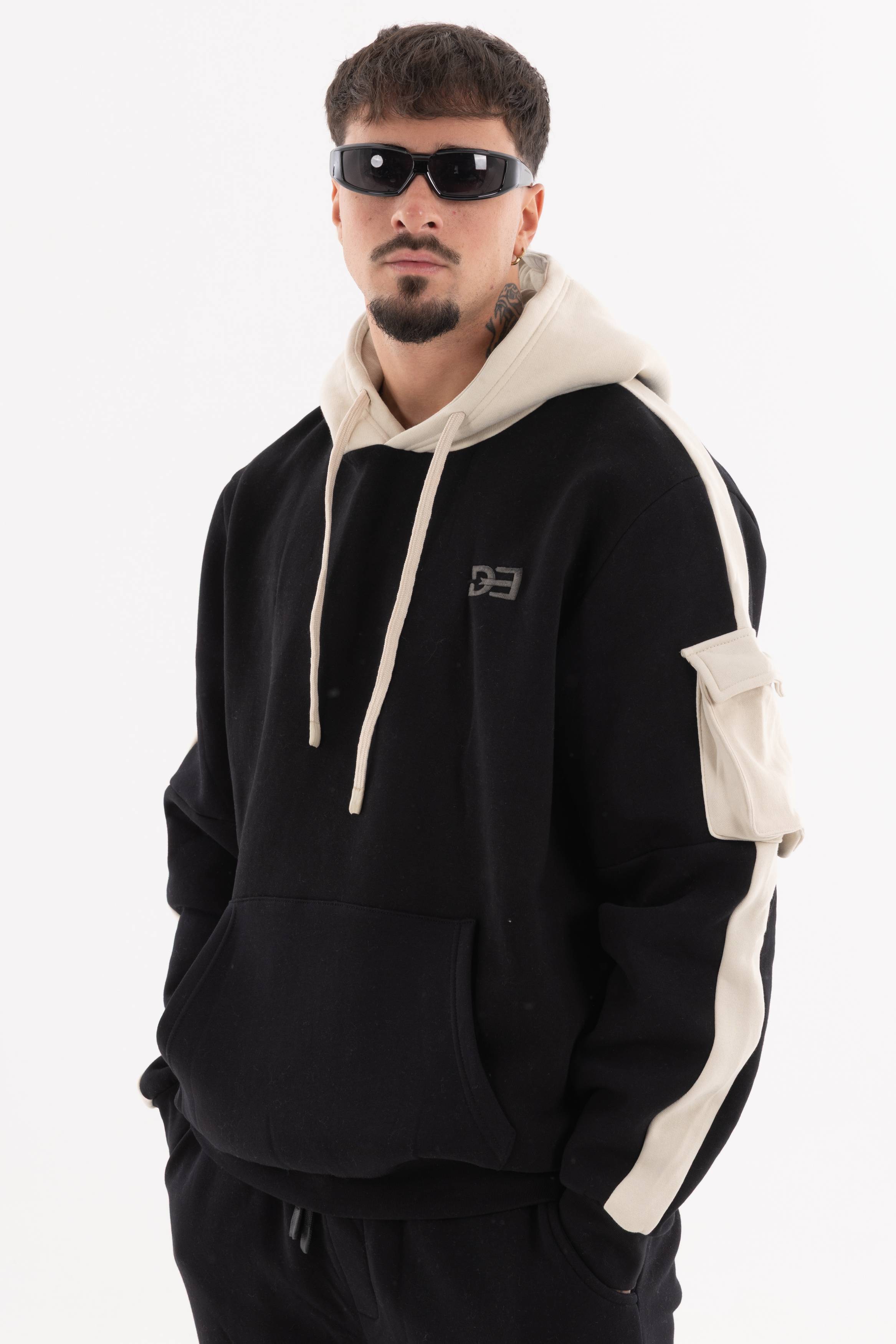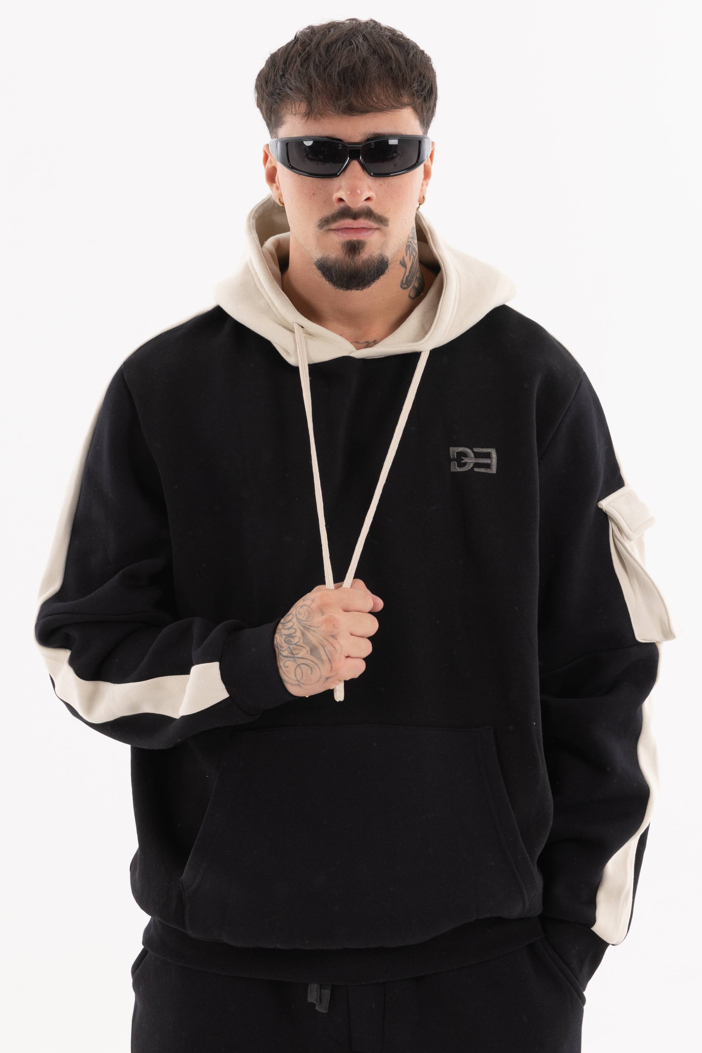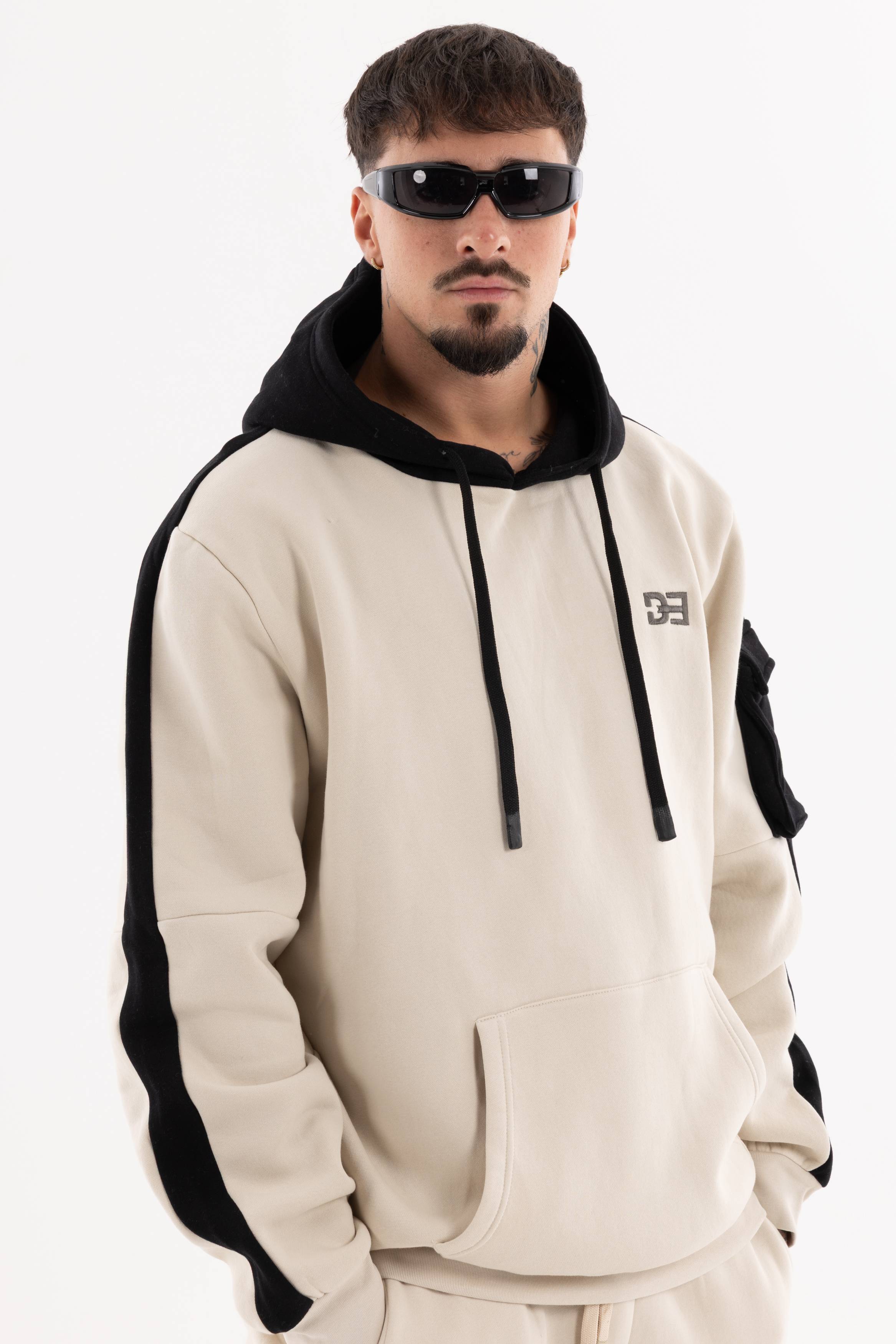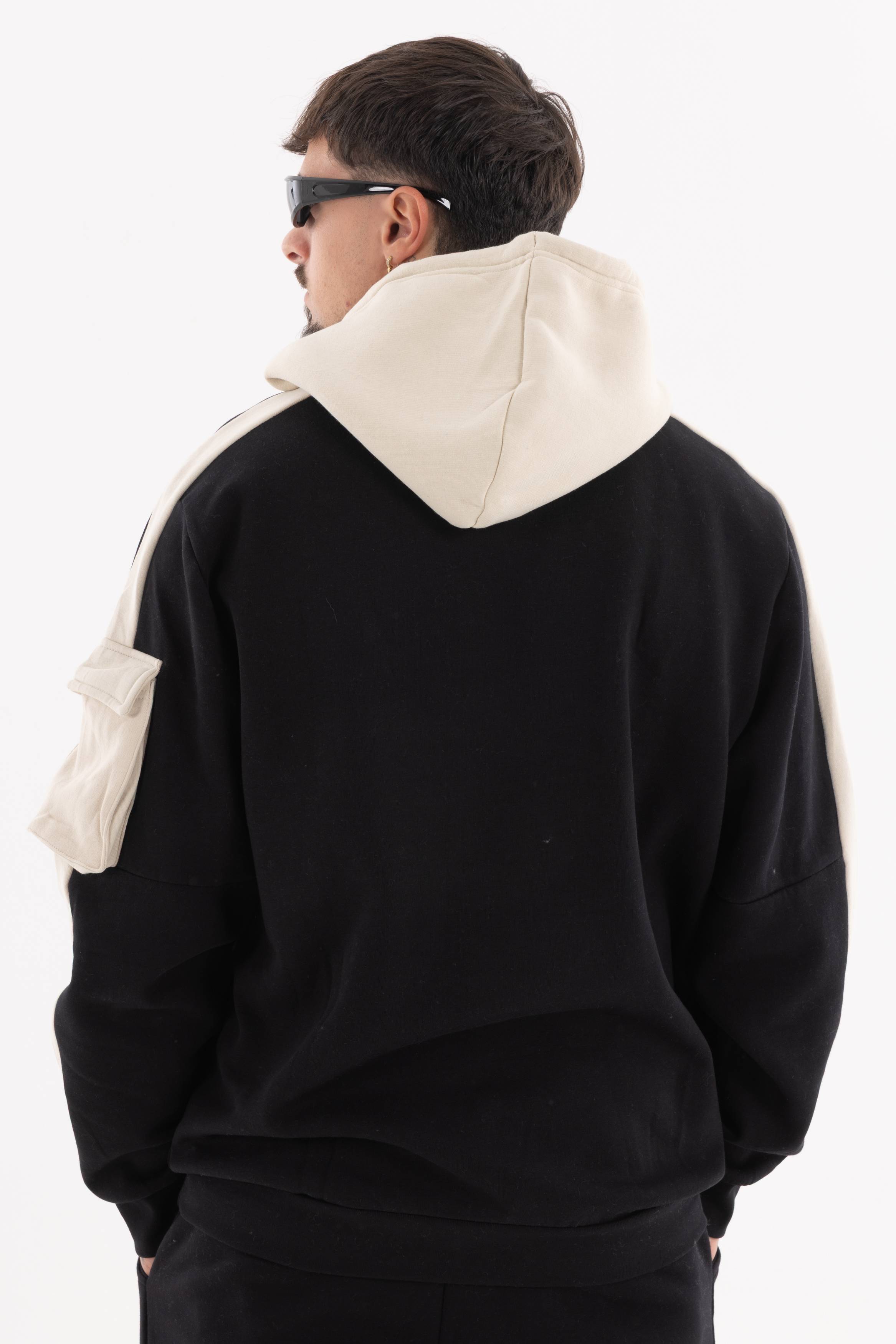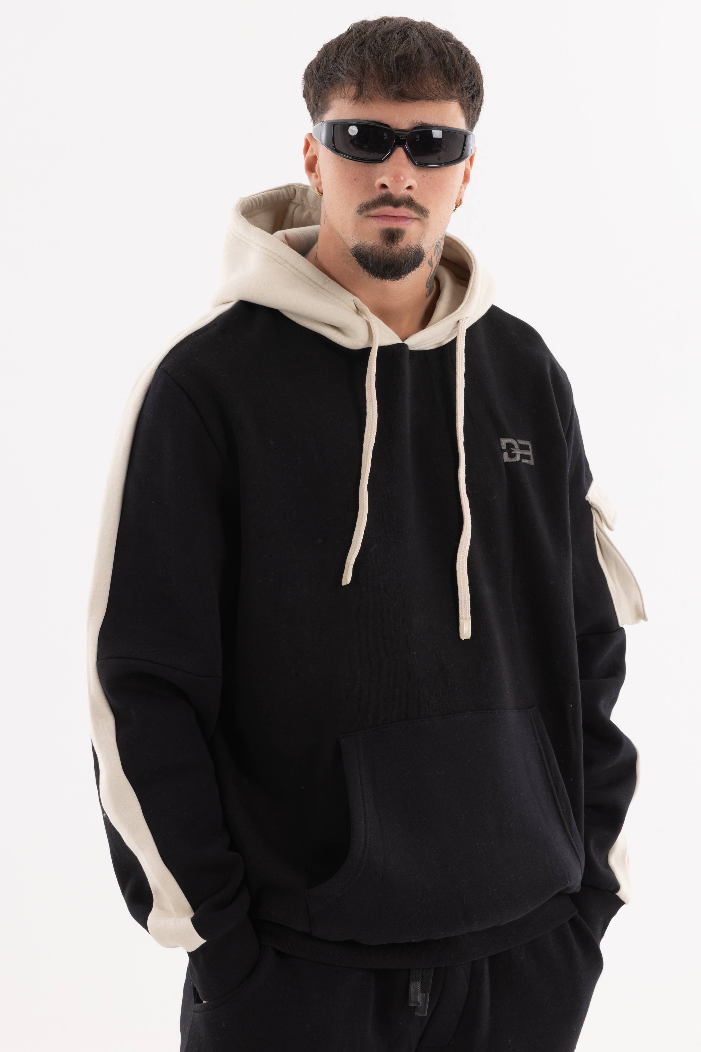 Felpa color block con cappuccio e tascone sul braccio. Capo dallo stile moderno e dinamico perfetto per chi ama outfit curati nei dettagli. Disponibili joggers coordinabili.