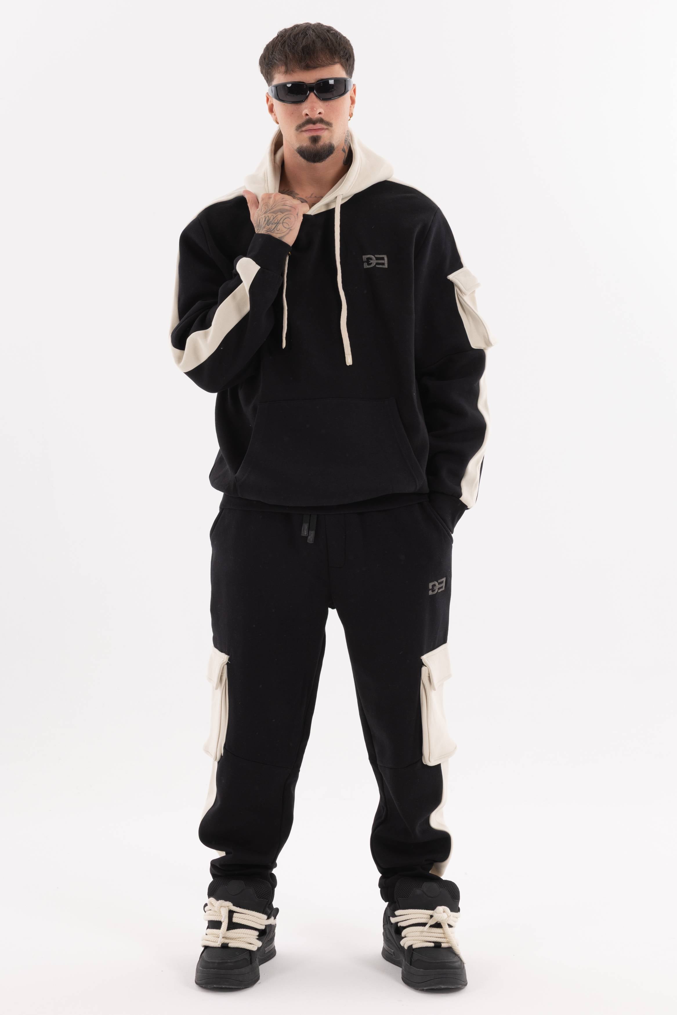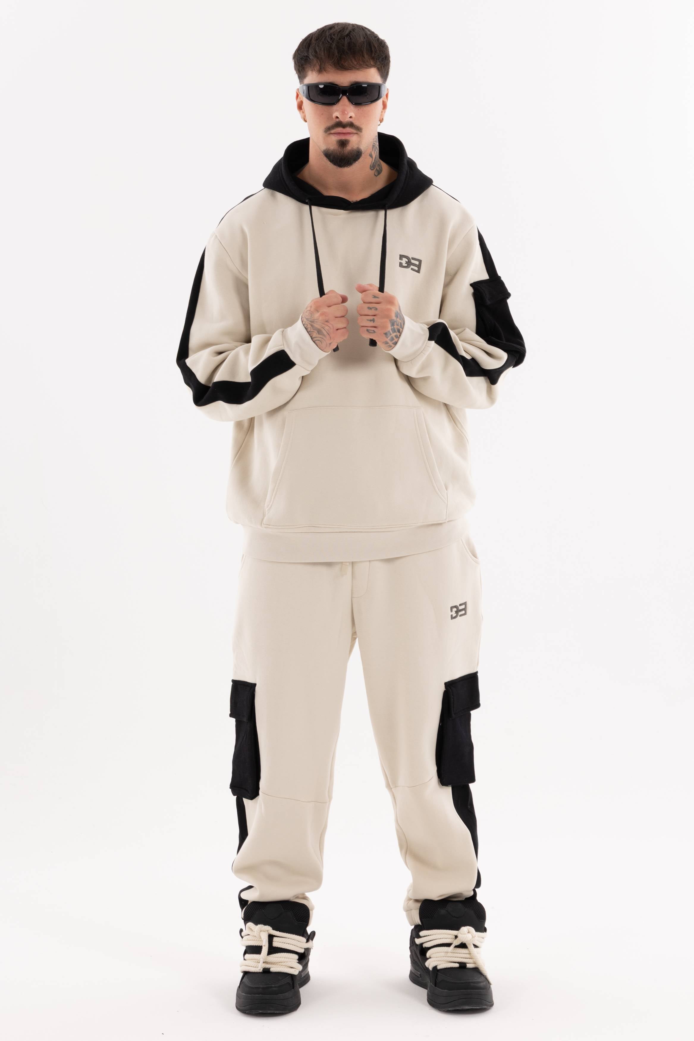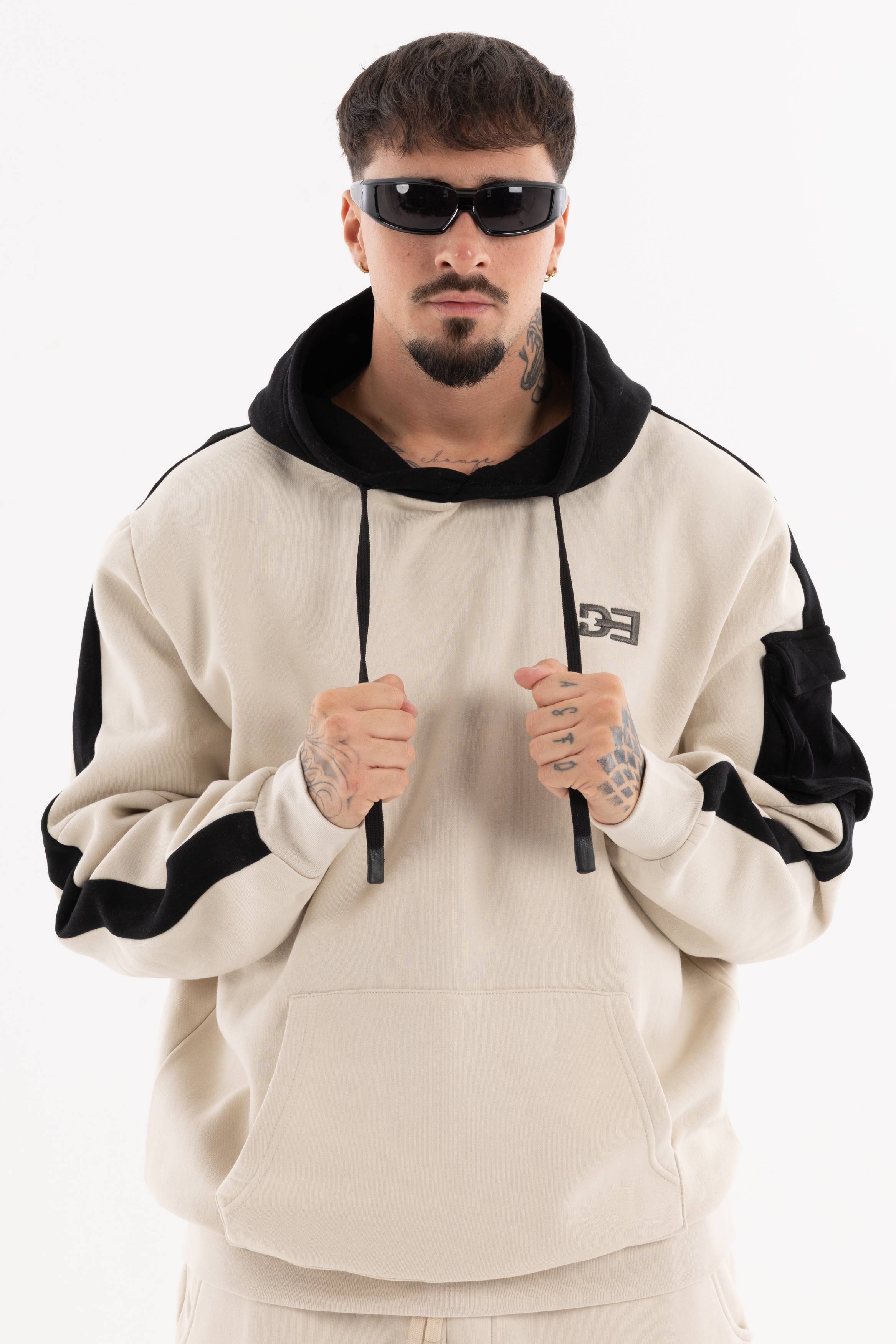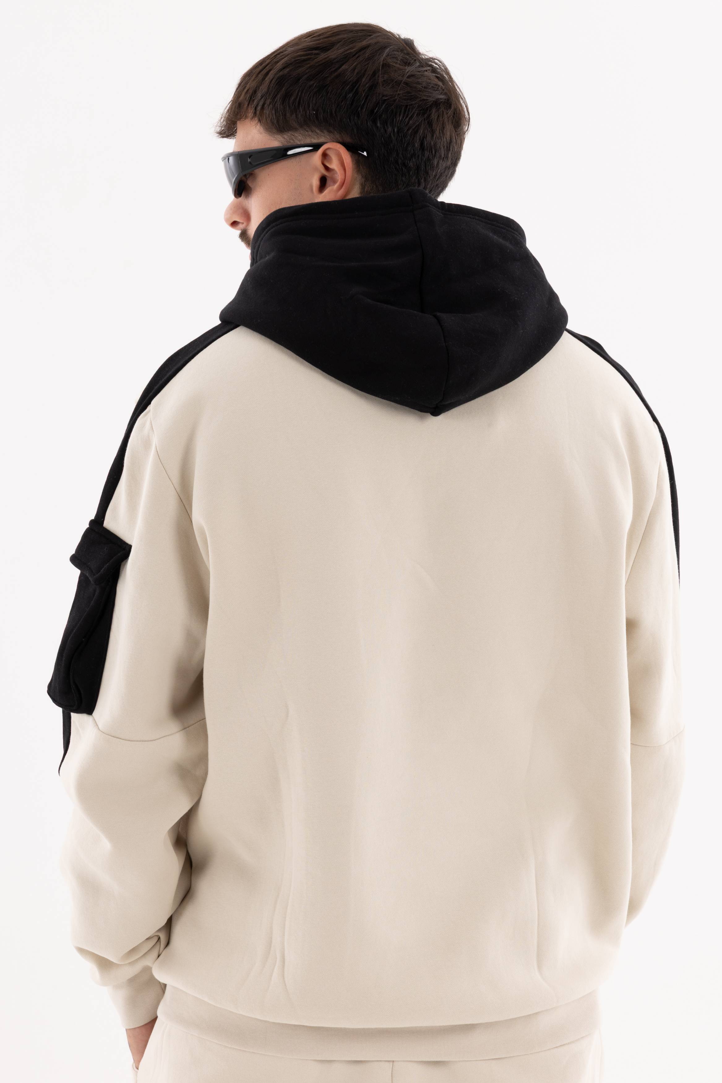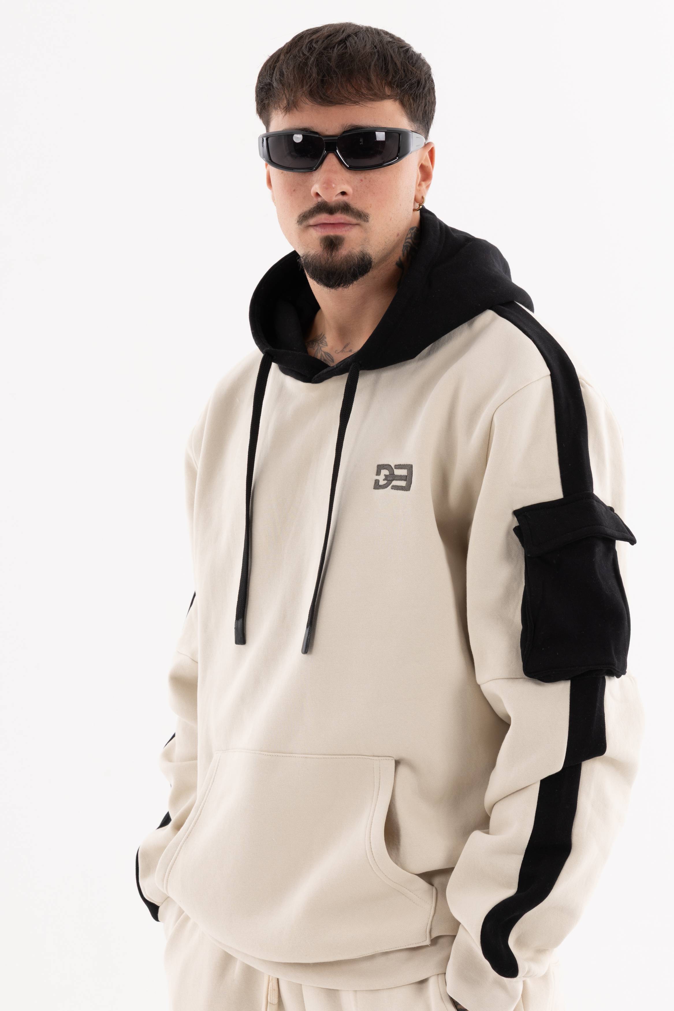Felpa color block con cappuccio e tascone sul braccio. Capo dallo stile moderno e dinamico perfetto per chi ama outfit curati nei dettagli. Disponibili joggers coordinabili.