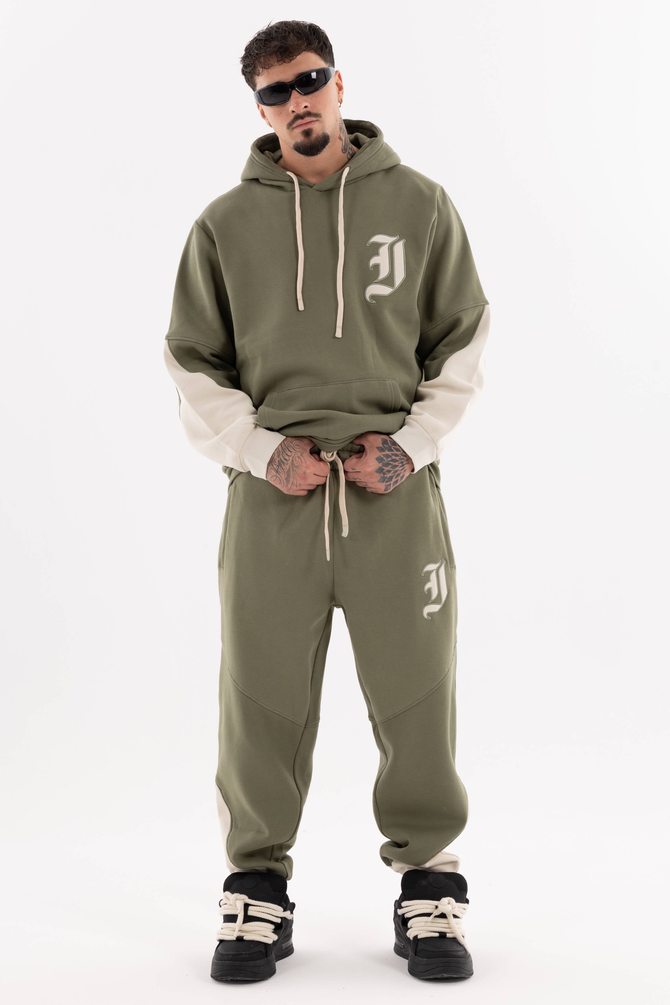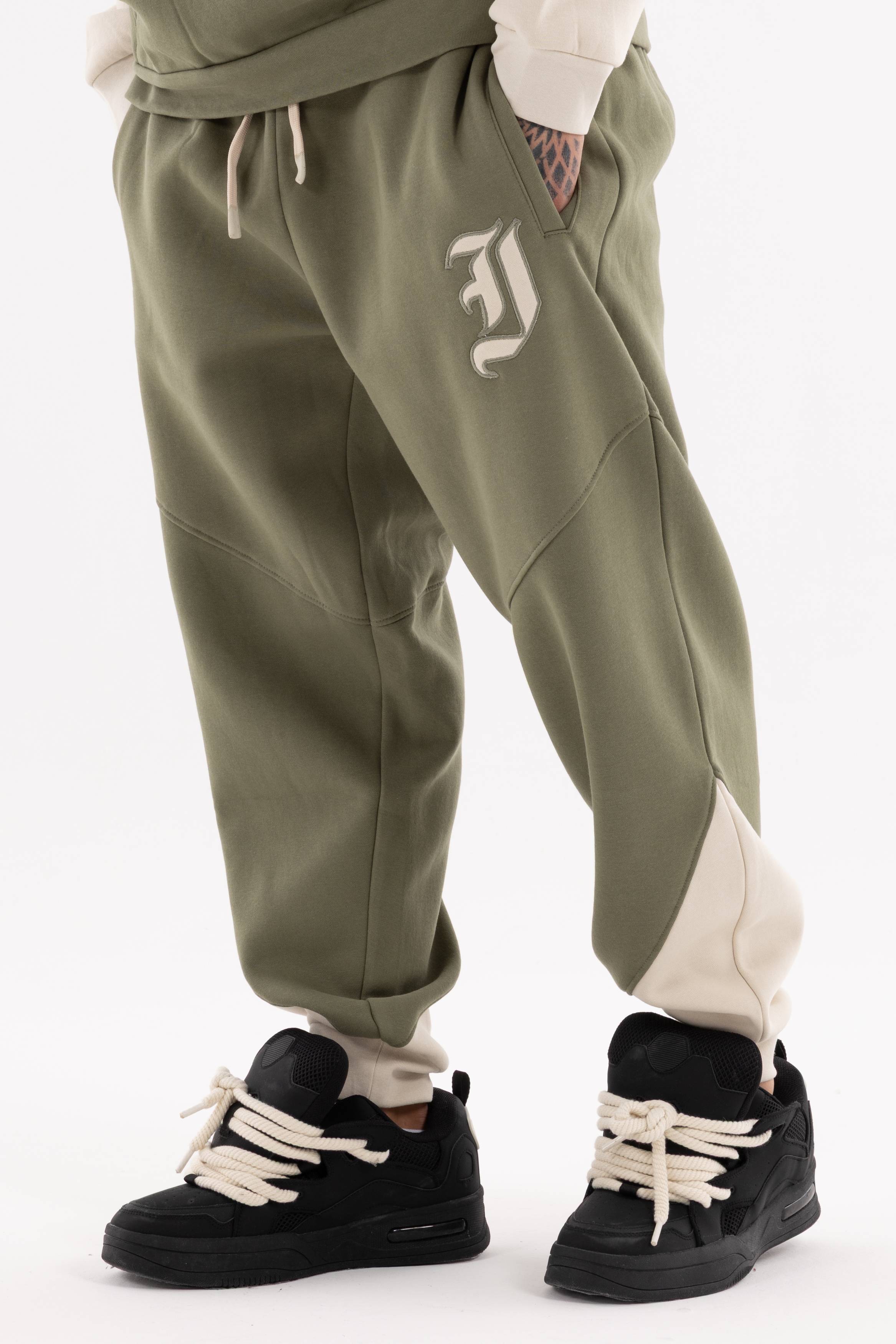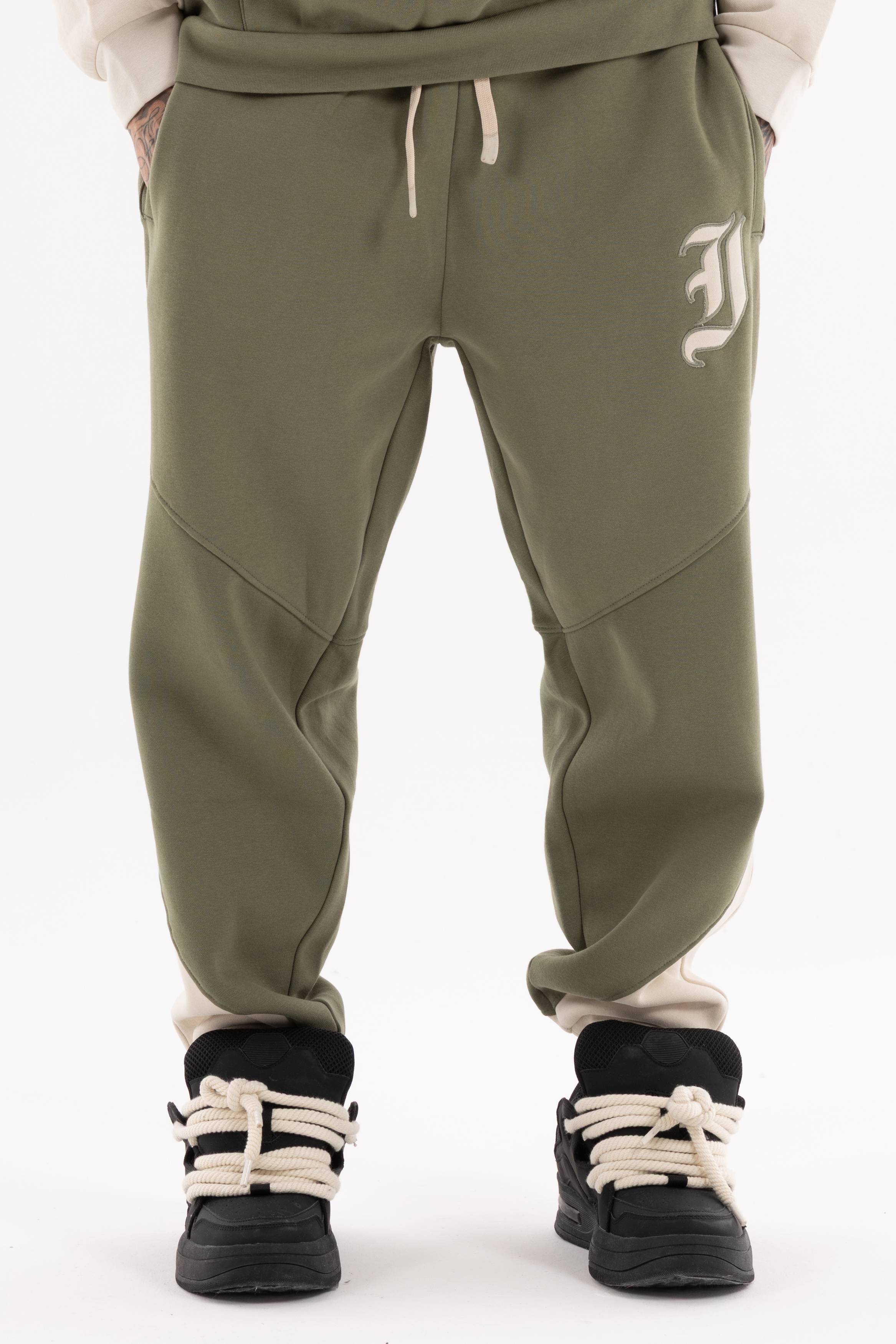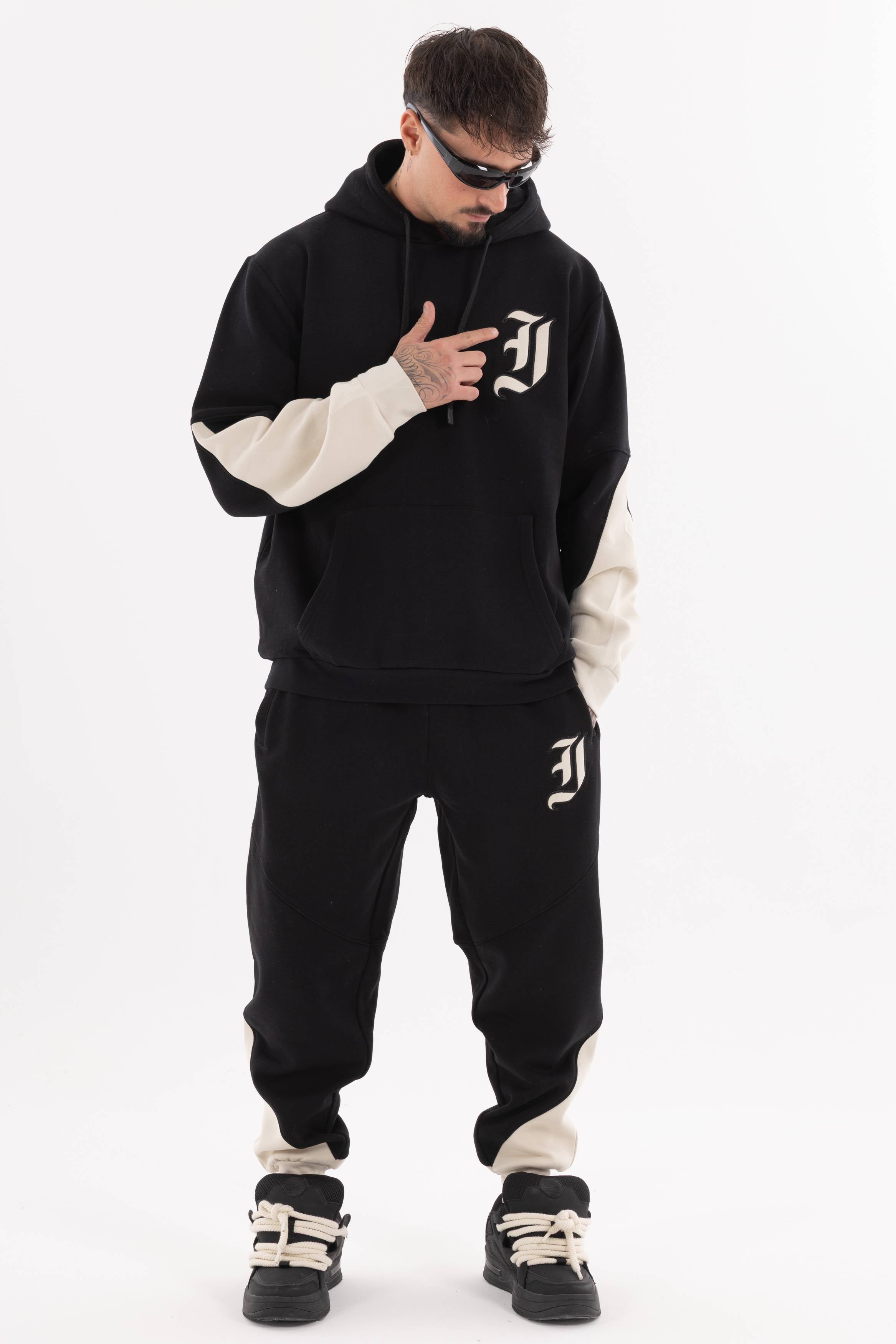 Pantaloni tuta color block con carattere gotico sulla gamba. Stile sportivo e moderno ideali per un look urbano deciso. Disponibile felpa coordinabile per un outfit completo.